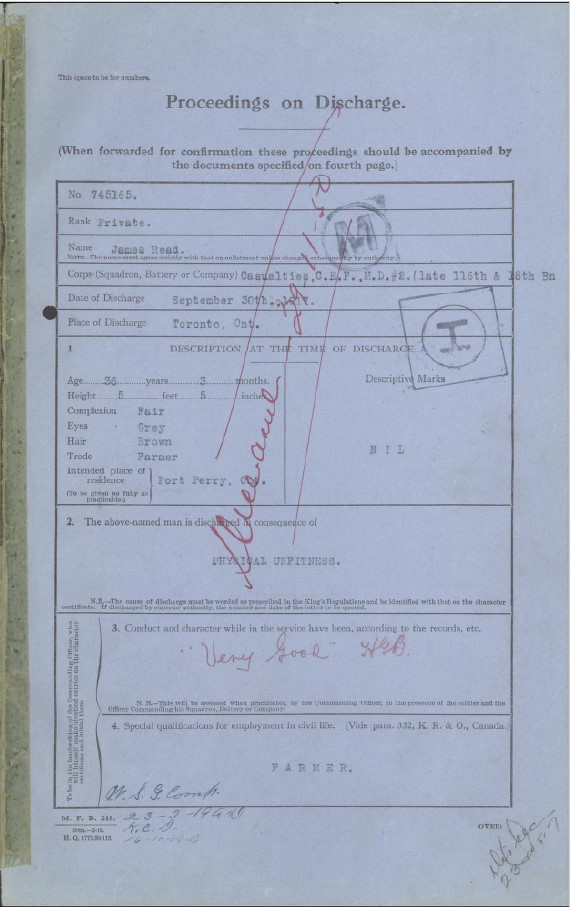 Family Search: James Read was born on 19 June 1881, in Norwich, Norfolk, England, United Kingdom. He had at least 1 daughter with Selina May Cogman. He immigrated to Canada in 1913 and lived in Port Perry, Ontario, Ontario, Canada in 1915. He registered for military service in 1915. In 1915, at the age of 34, his occupation is listed as farmer in Port Perry, Ontario, Ontario, Canada. He died on 29 November 1950, at the age of 69, and was buried in Ontario Pinegrove Cemetery, Port Perry, Durham, Ontario, Canada.