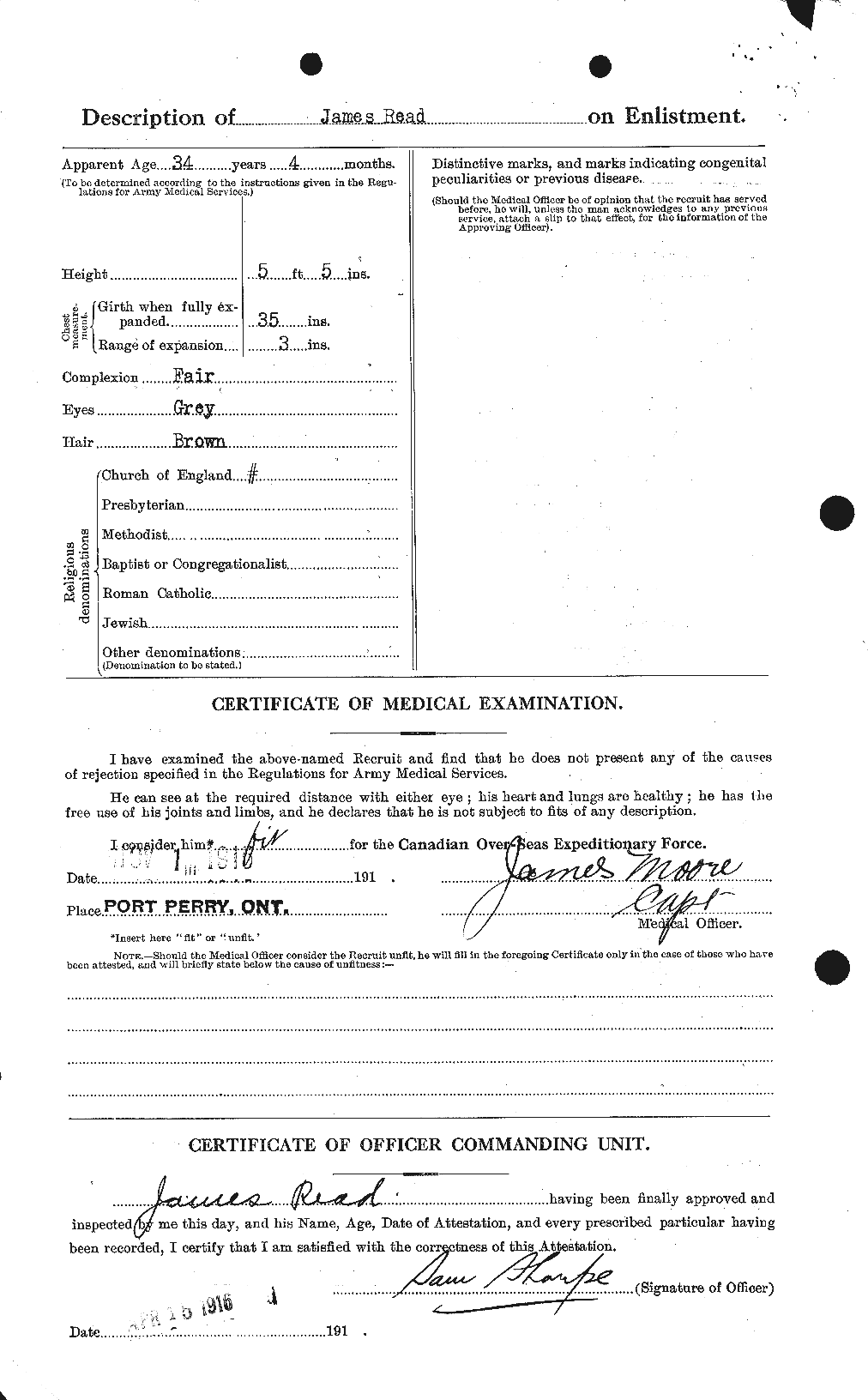 Family Search: James Read was born on 19 June 1881, in Norwich, Norfolk, England, United Kingdom. He had at least 1 daughter with Selina May Cogman. He immigrated to Canada in 1913 and lived in Port Perry, Ontario, Ontario, Canada in 1915. He registered for military service in 1915. In 1915, at the age of 34, his occupation is listed as farmer in Port Perry, Ontario, Ontario, Canada. He died on 29 November 1950, at the age of 69, and was buried in Ontario Pinegrove Cemetery, Port Perry, Durham, Ontario, Canada.