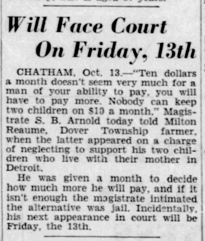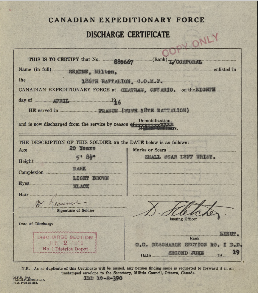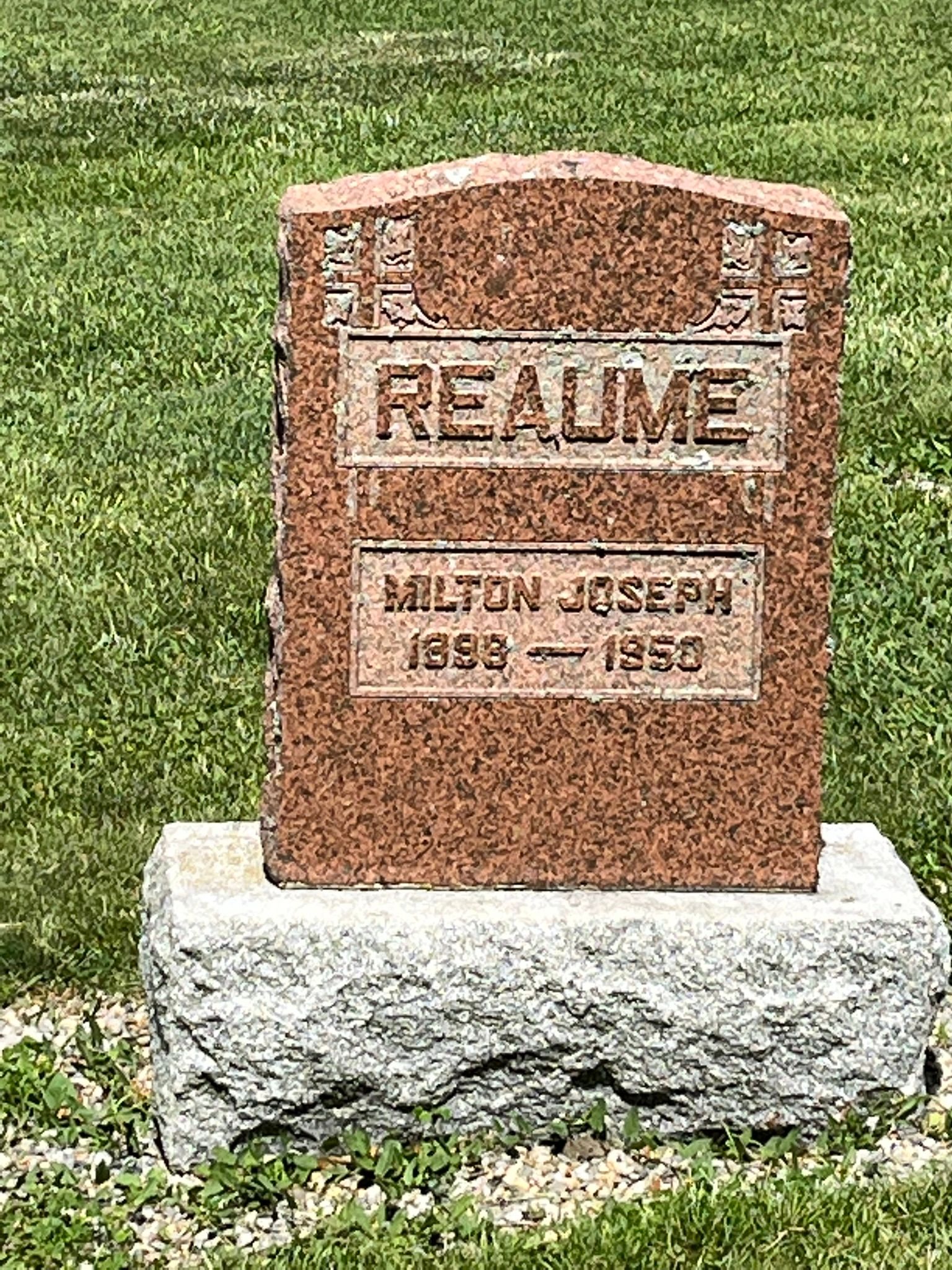 Family Search: When Lance-Corporal Milton Joseph Reaume was born on 9 April 1899, in Dover, Kent, Ontario, Canada, his father, Francis Frank Reaume, was 35 and his mother, Emma Duphette Duffette, was 25. He married Irene Marguerite Antaya on 27 August 1923, in Tilbury East, Kent, Ontario, Canada. They were the parents of at least 2 sons. He immigrated to Vermont, United States in 1924 and lived in Pain Court, Kent, Ontario, Canada in 1916 and Detroit, Wayne, Michigan, United States in 1930. He registered for military service in 1916. In 1916, at the age of 17, his occupation is listed as farmer in Pain Court, Kent, Ontario, Canada. He died on 4 January 1950, at the age of 50, and was buried in Saint Peter’s Roman Catholic Cemetery, Tilbury, Chatham-Kent, Ontario, Canada.