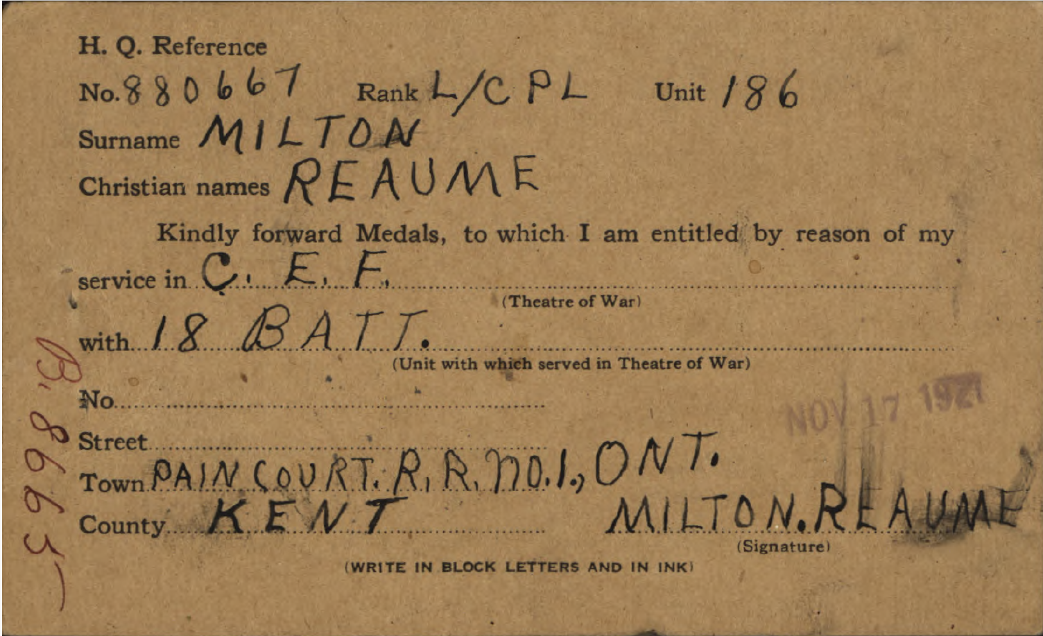 Lance Corporal Milton Joseph Reaume, reg. no. 880667.