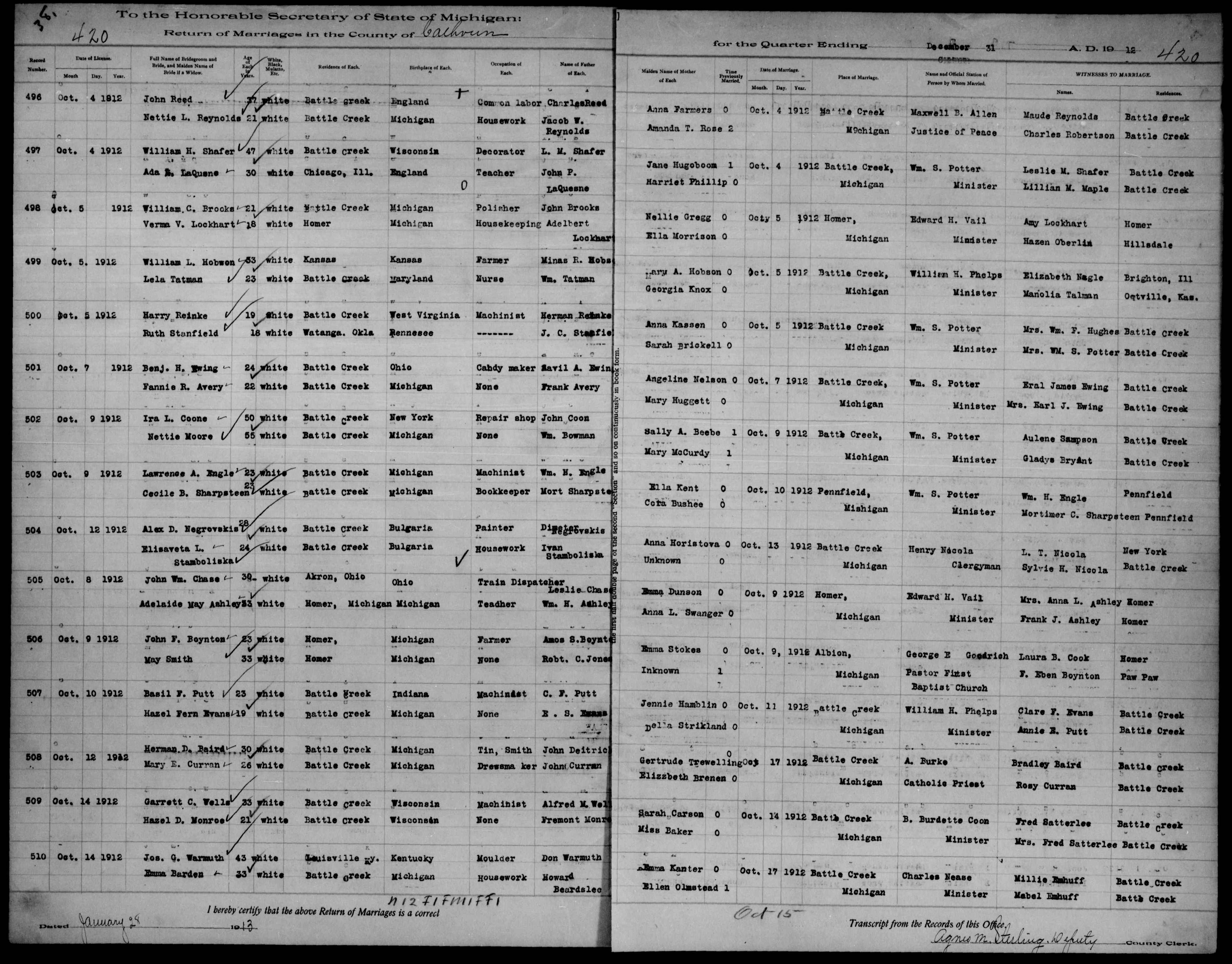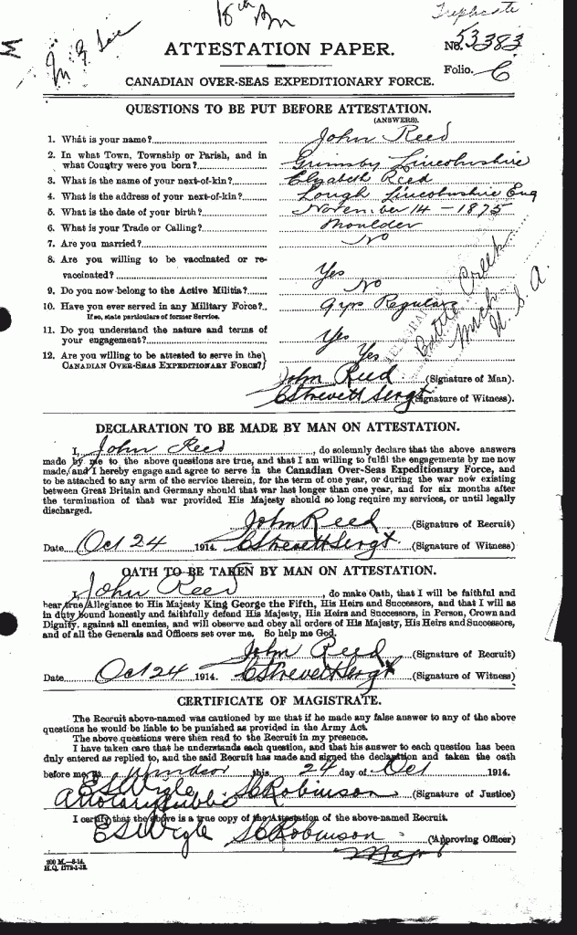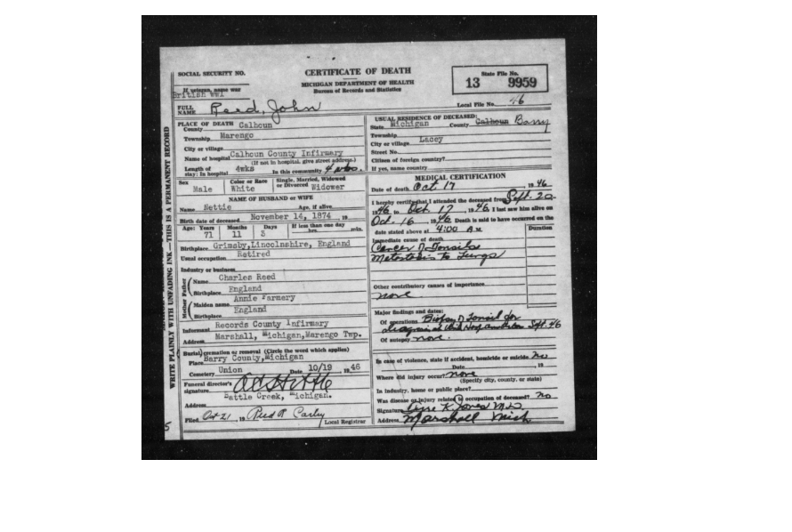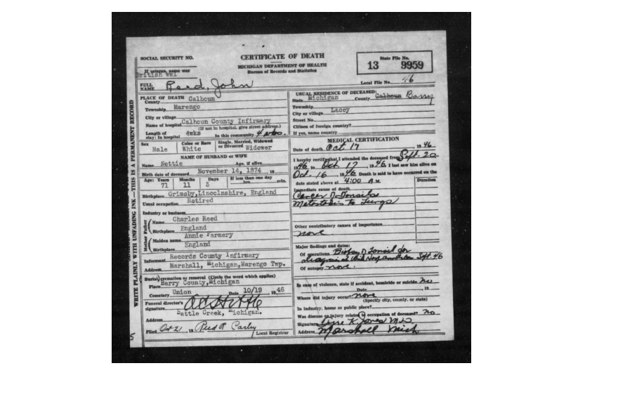 Family Search: When John Henry Reed was born on 14 November 1874, in Grimsby, Lincolnshire, England, United Kingdom, his father, Charles Reed, was 30 and his mother, Ann Farmery, was 29. He married Nettie L. Reynolds on 4 October 1912, in Battle Creek, Calhoun, Michigan, United States. He lived in Saltfleetby St Clement, Lincolnshire, England, United Kingdom in 1881 and Battle Creek, Calhoun, Michigan, United States in 1920. He registered for military service in 1914. In 1914, at the age of 40, his occupation is listed as moulder. He died on 17 October 1946, in Marengo, Calhoun, Michigan, United States, at the age of 71, and was buried in Union Cemetery, Barry, Michigan, United States.