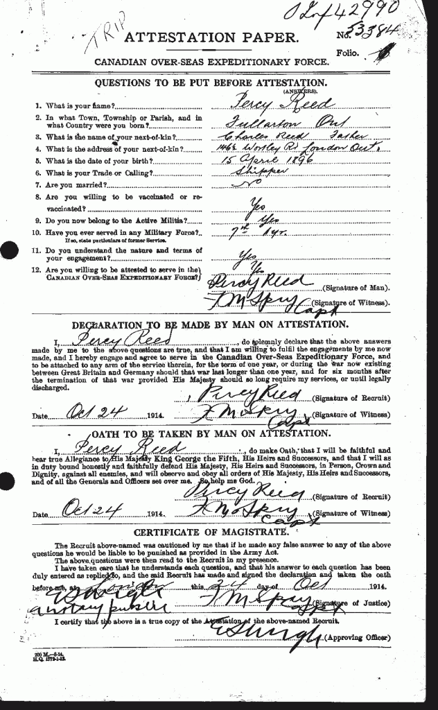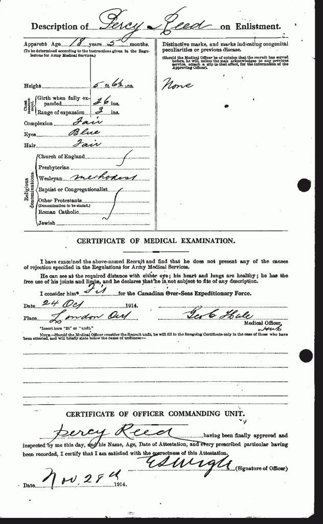 Family Search: When Sergeant Percy Lorne Reed was born on 15 April 1897, in Fullarton Township, Perth, Ontario, Canada, his father, Charles Robert Reed, was 27 and his mother, Maggie Powell, was 28. He married Alice Maud Hilton about 1920, in London, Canada West, British North America. They were the parents of at least 1 son. He lived in London, Canada West, British North America in 1911. He registered for military service in 1914. In 1961, at the age of 64, his occupation is listed as purchasing agent, at a london, ontario department store in London, Ontario, Canada. He died on 7 May 1963, in London, Ontario, Canada, at the age of 66, and was buried in Mount Pleasant Cemetery, West McGillivray, Middlesex, Ontario, Canada.