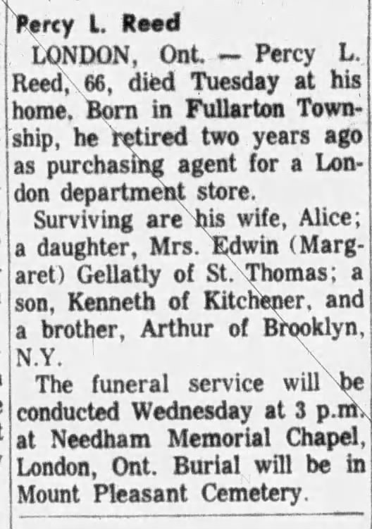 Family Search: When Sergeant Percy Lorne Reed was born on 15 April 1897, in Fullarton Township, Perth, Ontario, Canada, his father, Charles Robert Reed, was 27 and his mother, Maggie Powell, was 28. He married Alice Maud Hilton about 1920, in London, Canada West, British North America. They were the parents of at least 1 son. He lived in London, Canada West, British North America in 1911. He registered for military service in 1914. In 1961, at the age of 64, his occupation is listed as purchasing agent, at a london, ontario department store in London, Ontario, Canada. He died on 7 May 1963, in London, Ontario, Canada, at the age of 66, and was buried in Mount Pleasant Cemetery, West McGillivray, Middlesex, Ontario, Canada.