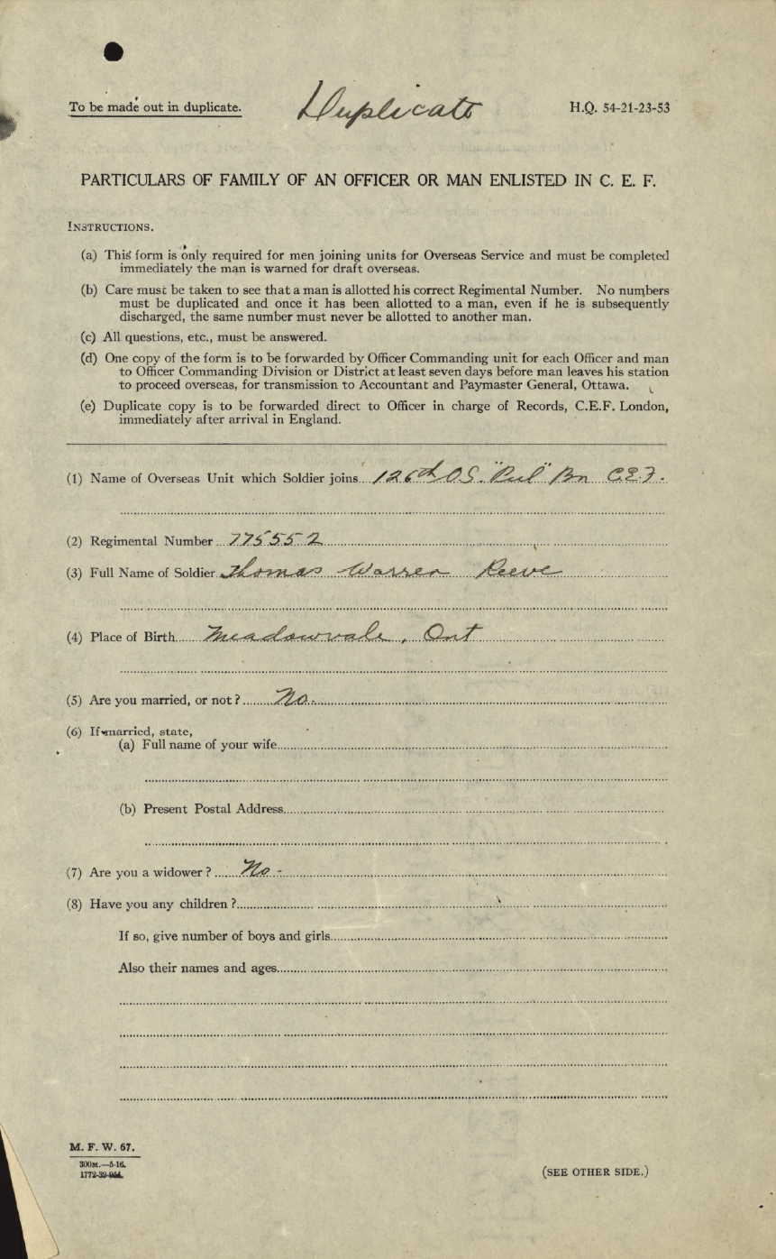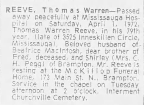 Family Search: When Private Thomas Warren Reeve was born on 26 June 1893, in Meadowvale, Peel, Ontario, Canada, his father, Sigsworth Simpson Reeve, was 36 and his mother, Sarah Elizabeth McClure, was 33. He married Beatrice McIntosh on 18 November 1939, in Toronto, Ontario, Canada. He lived in Toronto, York, Ontario, Canada in 1915 and Toronto Township, Peel, Ontario, Canada in 1931. He registered for military service in 1915. In 1915, at the age of 22, his occupation is listed as salesman in Toronto, York, Ontario, Canada. He died on 1 April 1972, in Mississauga, Peel, Ontario, Canada, at the age of 78, and was buried in Churchville Cemetery, Churchville, Brampton, Peel, Ontario, Canada.