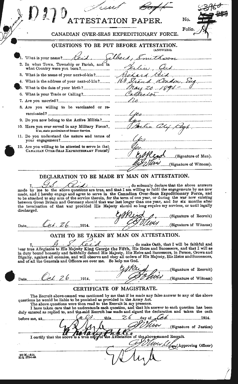 He was a collector and listed his next-of-kin as Richard Reid, of 163 Strand, London, England.