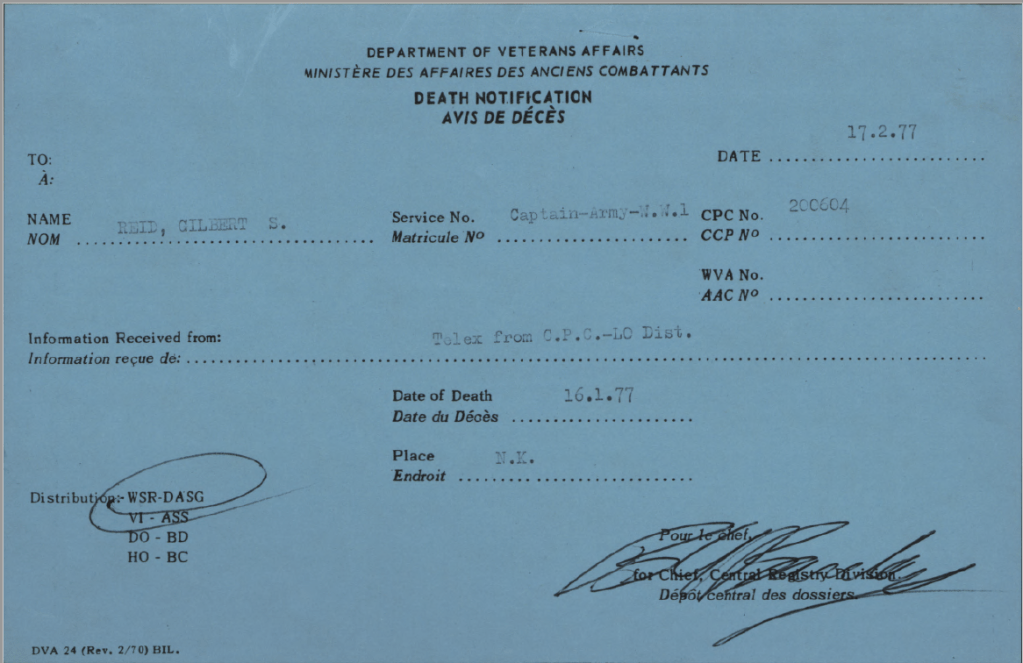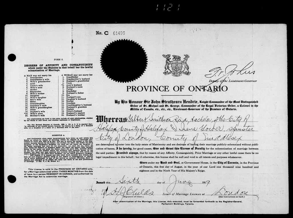 Family Search: When Gilbert Smithson Reid was born on 20 May 1895, in Kitchener, Waterloo, Ontario, Canada, his father, Richard Reid, was 32 and his mother, Alice Woodsend, was 35. He married Irene Gower on 16 June 1919, in London, Ontario, Canada West, British Colonial America. They were the parents of at least 1 son and 1 daughter. He registered for military service in 1914. In 1914, at the age of 19, his occupation is listed as collector. He died on 16 January 1977, at the age of 81, and was buried in Acacia Park Cemetery, North Tonawanda, Niagara, New York, United States.