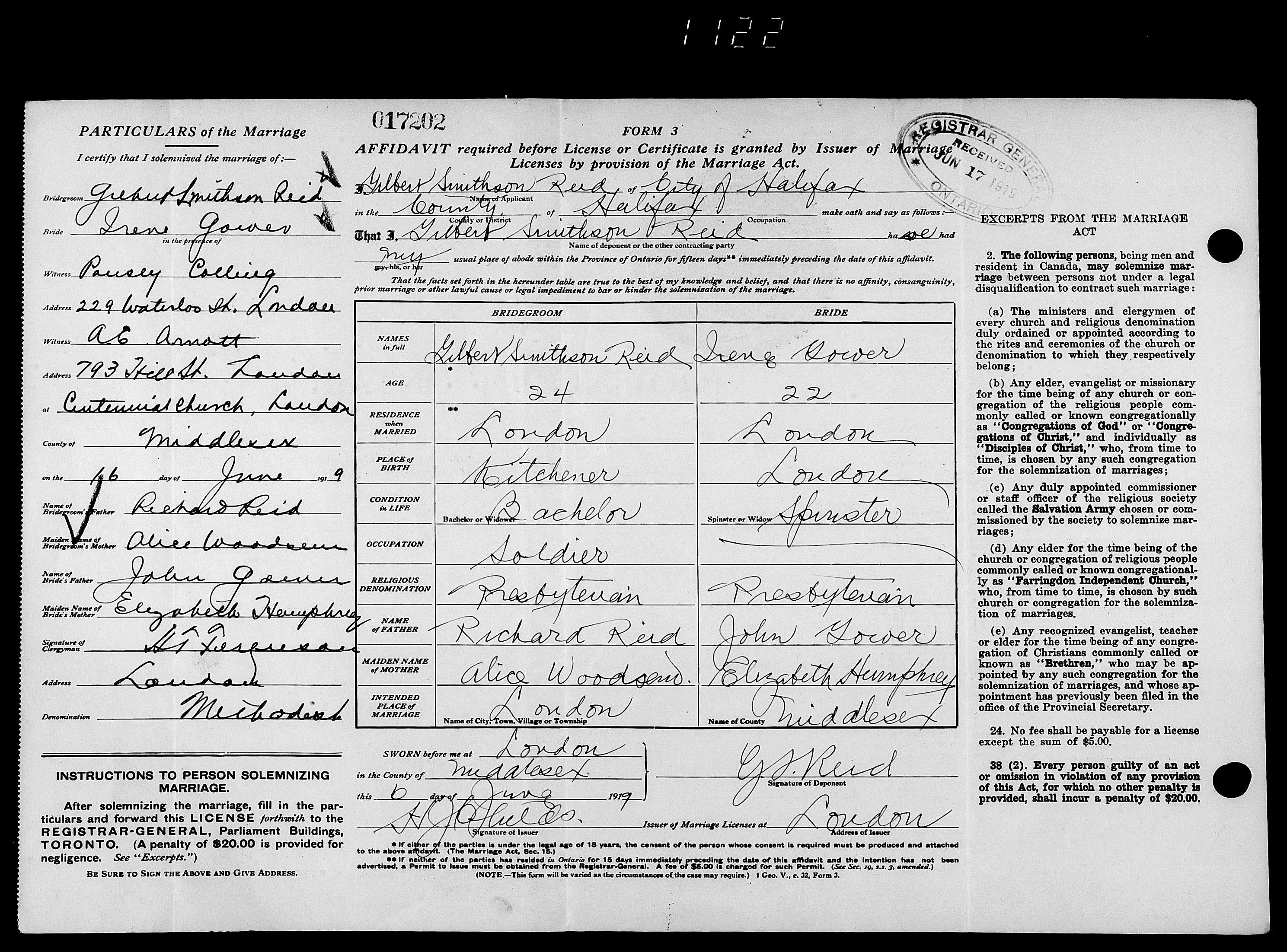 Family Search: When Gilbert Smithson Reid was born on 20 May 1895, in Kitchener, Waterloo, Ontario, Canada, his father, Richard Reid, was 32 and his mother, Alice Woodsend, was 35. He married Irene Gower on 16 June 1919, in London, Ontario, Canada West, British Colonial America. They were the parents of at least 1 son and 1 daughter. He registered for military service in 1914. In 1914, at the age of 19, his occupation is listed as collector. He died on 16 January 1977, at the age of 81, and was buried in Acacia Park Cemetery, North Tonawanda, Niagara, New York, United States.