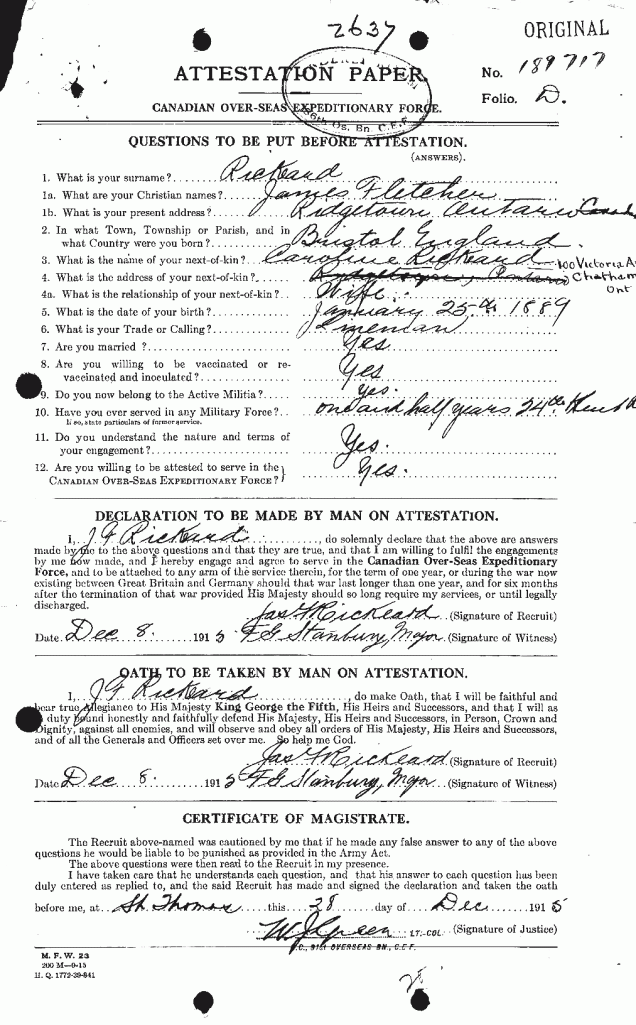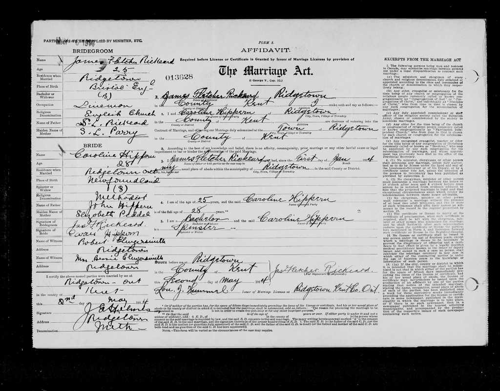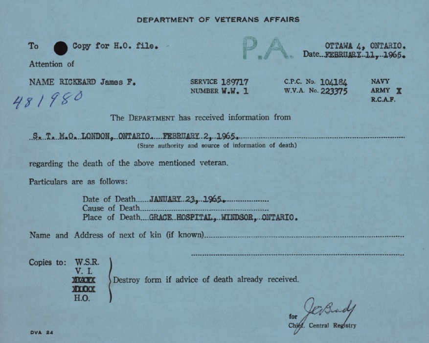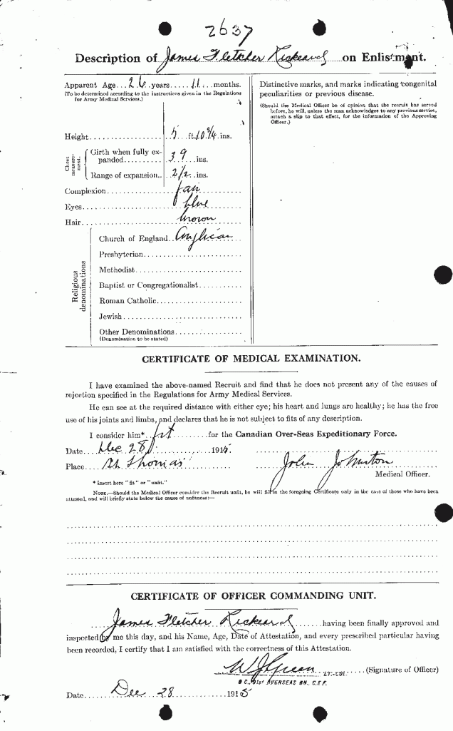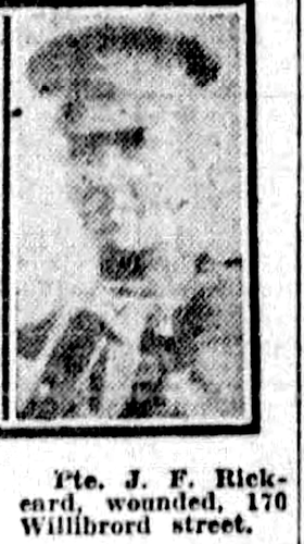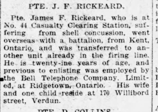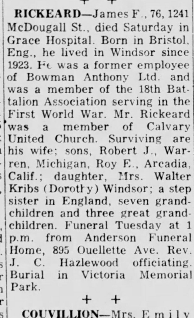 Family Search: When Lance-Corporal James Fletcher Rickeard was born on 25 January 1889, in Bristol, England, United Kingdom, his father, Simon Lawer Rickeard, was 40 and his mother, Sarah Louisa Parry, was 25. He married Caroline Hippern on 2 May 1914, in Ridgetown, Kent, Ontario, Canada. They were the parents of at least 2 sons and 2 daughters. He lived in Gloucestershire, England, United Kingdom in 1891 and Ridgetown, Kent, Ontario, Canada in 1916. He registered for military service in 1916. In 1915, at the age of 26, his occupation is listed as lineman, bell telephone in Chatham, Kent, Ontario, Canada. He died on 23 January 1965, in Windsor, Essex, Ontario, Canada, at the age of 75, and was buried in Oldcastle, Tecumseh, Essex, Ontario, Canada.