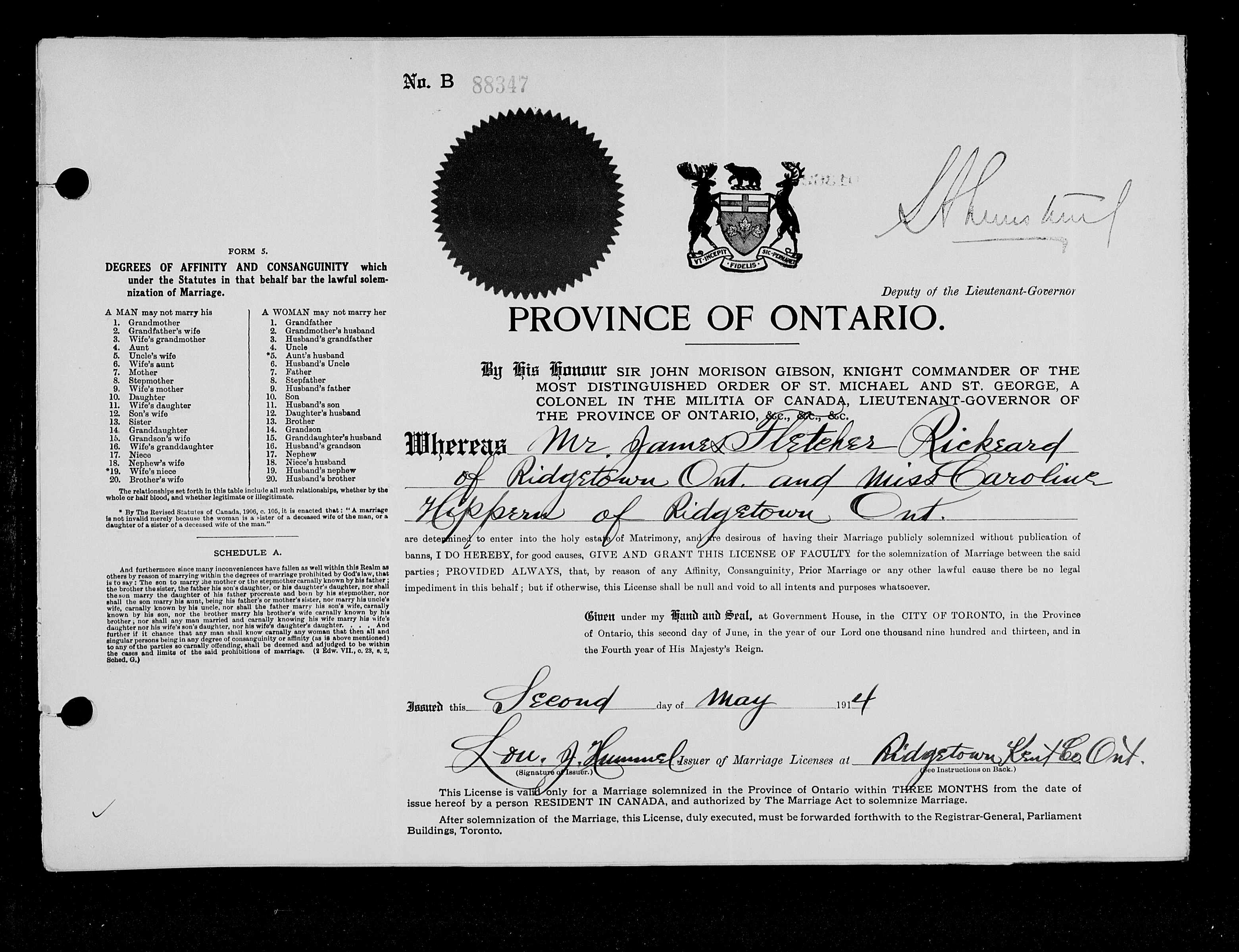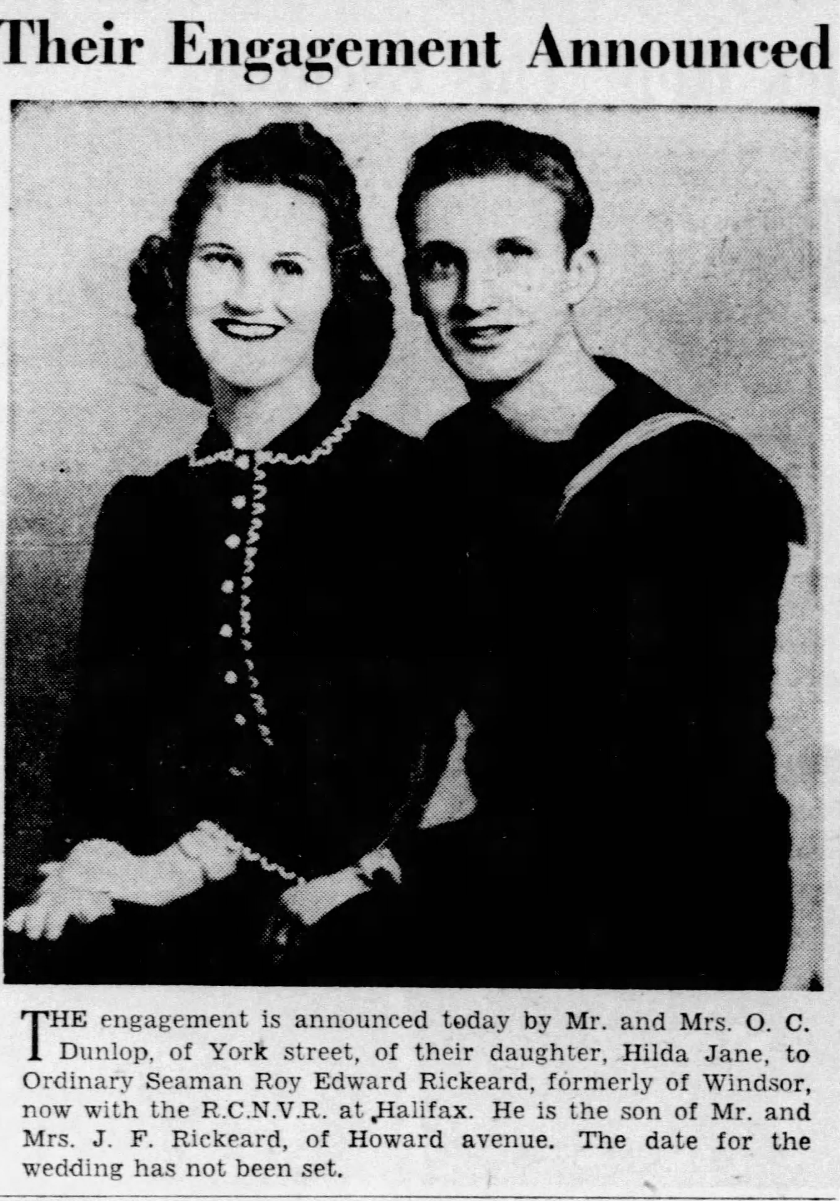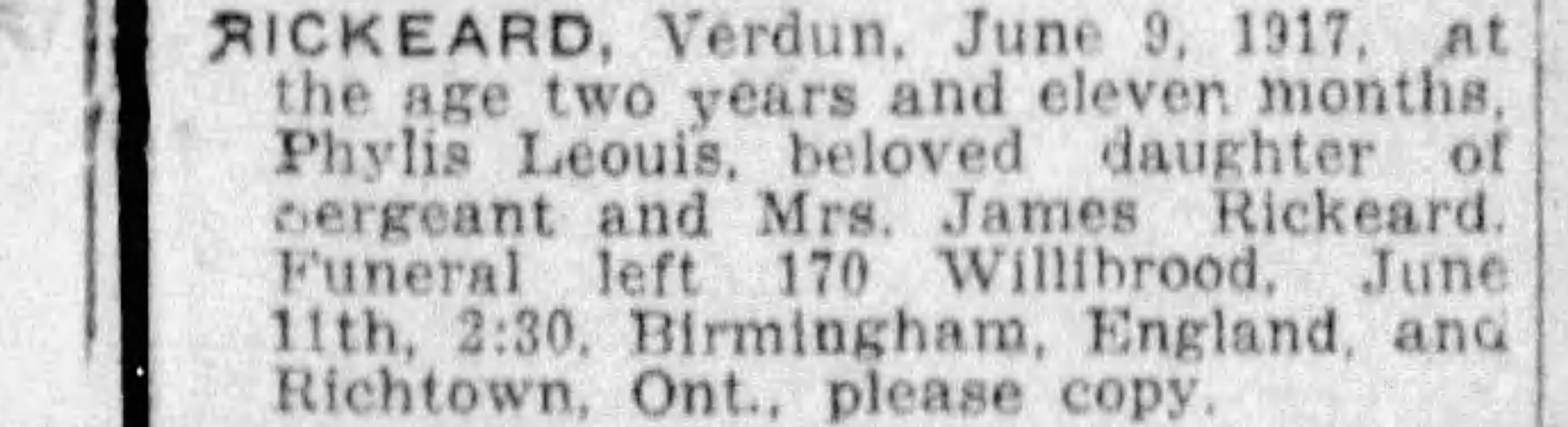 Family Search: When Lance-Corporal James Fletcher Rickeard was born on 25 January 1889, in Bristol, England, United Kingdom, his father, Simon Lawer Rickeard, was 40 and his mother, Sarah Louisa Parry, was 25. He married Caroline Hippern on 2 May 1914, in Ridgetown, Kent, Ontario, Canada. They were the parents of at least 2 sons and 2 daughters. He lived in Gloucestershire, England, United Kingdom in 1891 and Ridgetown, Kent, Ontario, Canada in 1916. He registered for military service in 1916. In 1915, at the age of 26, his occupation is listed as lineman, bell telephone in Chatham, Kent, Ontario, Canada. He died on 23 January 1965, in Windsor, Essex, Ontario, Canada, at the age of 75, and was buried in Oldcastle, Tecumseh, Essex, Ontario, Canada.