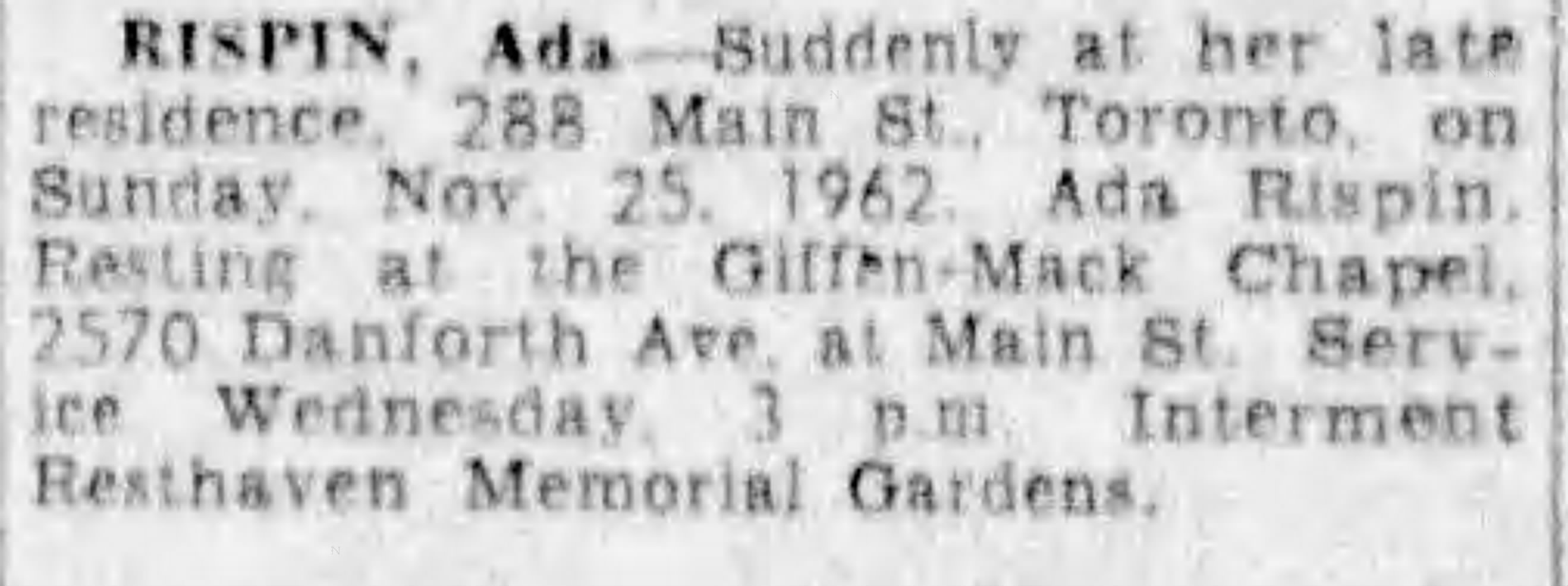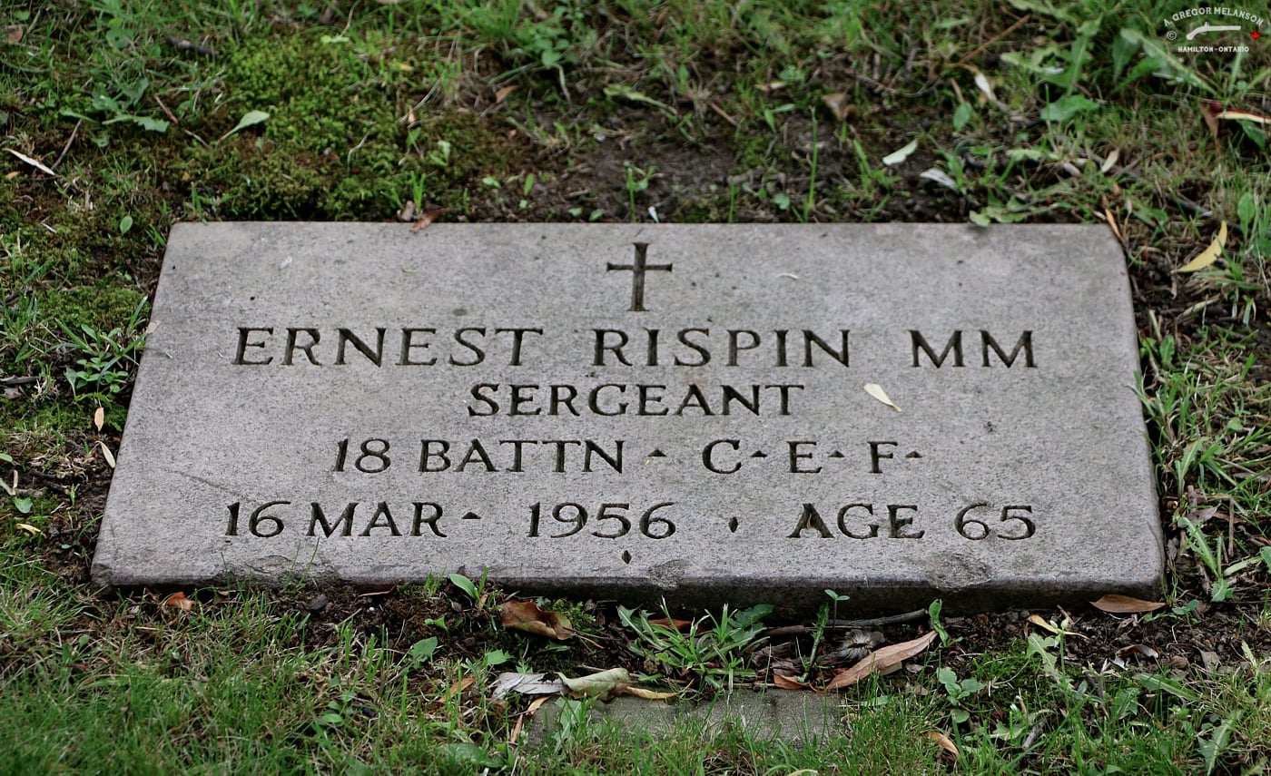 Family Search: Sergeant Ernest Rispin was born on 1 January 1891, in Beverley, Yorkshire, England, United Kingdom as the son of Rispin and Mary. He immigrated to Quebec City, Quebec, Canada in 1911 and lived in Toronto, York, Ontario, Canada in 1931 and Edmonton, Alberta, Canada in 1947. He registered for military service in 1914. In 1931, at the age of 40, his occupation is listed as laborer in Toronto, York, Ontario, Canada. He died on 16 March 1956, in Toronto, Ontario, Canada, at the age of 65, and was buried in York Cemetery, Toronto, Ontario, Canada.