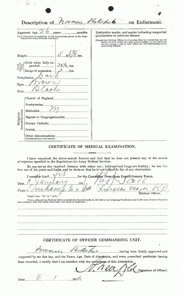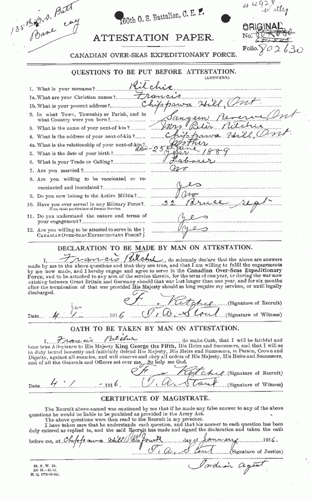 Family Search: When Private Francis Ritchie was born on 25 June 1889, in Chippawa Hill, Saugeen 29, Bruce, Ontario, Canada, his father, Peter Mamawassige Ritchie, was 42 and his mother, Sophia Wahbezee, was 17. He lived in Bruce, Ontario, Canada in 1911. He registered for military service in 1916. In 1916, at the age of 27, his occupation is listed as labourer in Chippawa Hill, Saugeen 29, Bruce, Ontario, Canada. He died on 29 September 1924, at the age of 35, and was buried in Chippawa Hill Saugeen Reserve Cemetery, Chippawa Hill, Saugeen 29, Bruce, Ontario, Canada.