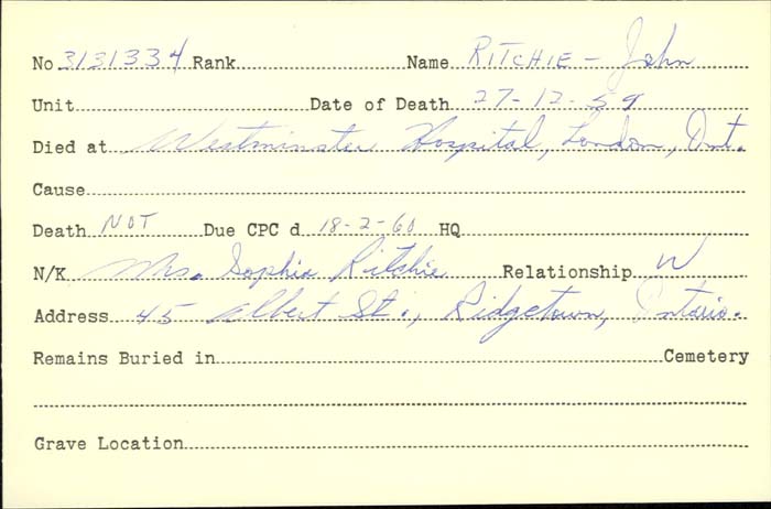 Ritchie, John William: Service no. 3131334 Digitized Service Record Source: Gathering Our Heroes. Find-A-Grave Ritchie, John William: Service no. 3131334. Source: Gathering Our Heroes. Share this: Click to email a link to a friend (Opens in new window) Email Click to share on Facebook (Opens in new window) Facebook Click to share on X (Opens in new window) X Click to share on Reddit (Opens in new window) Reddit Click to share on LinkedIn (Opens in new window) LinkedIn Click to print (Opens in new window) Print Click to share on Tumblr (Opens in new window) Tumblr Click to share on Pocket (Opens in new window) Pocket Click to share on Pinterest (Opens in new window) Pinterest Click to share on Telegram (Opens in new window) Telegram Click to share on WhatsApp (Opens in new window) WhatsApp Like Loading...