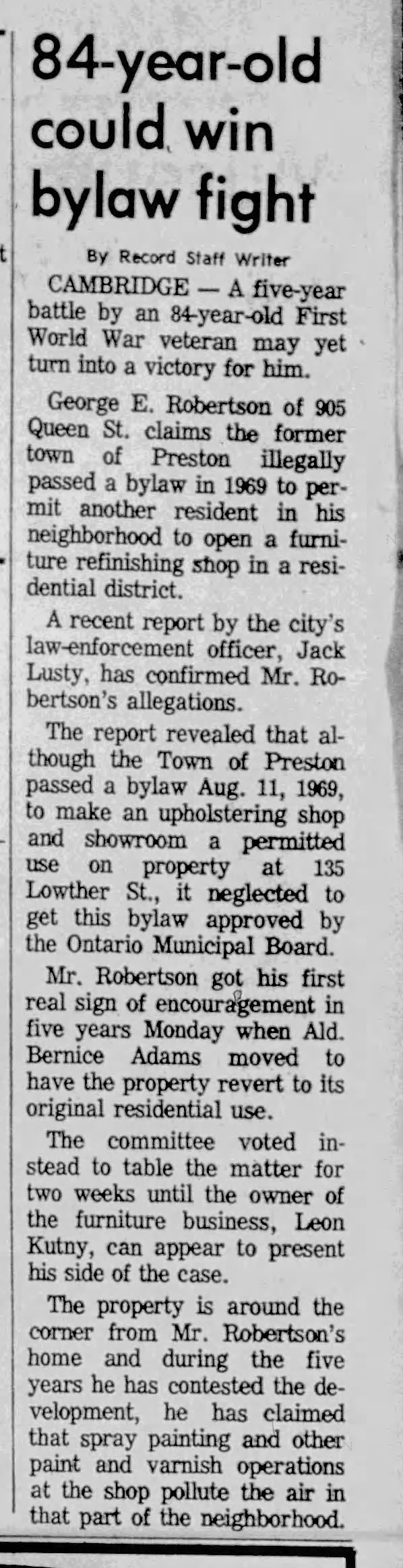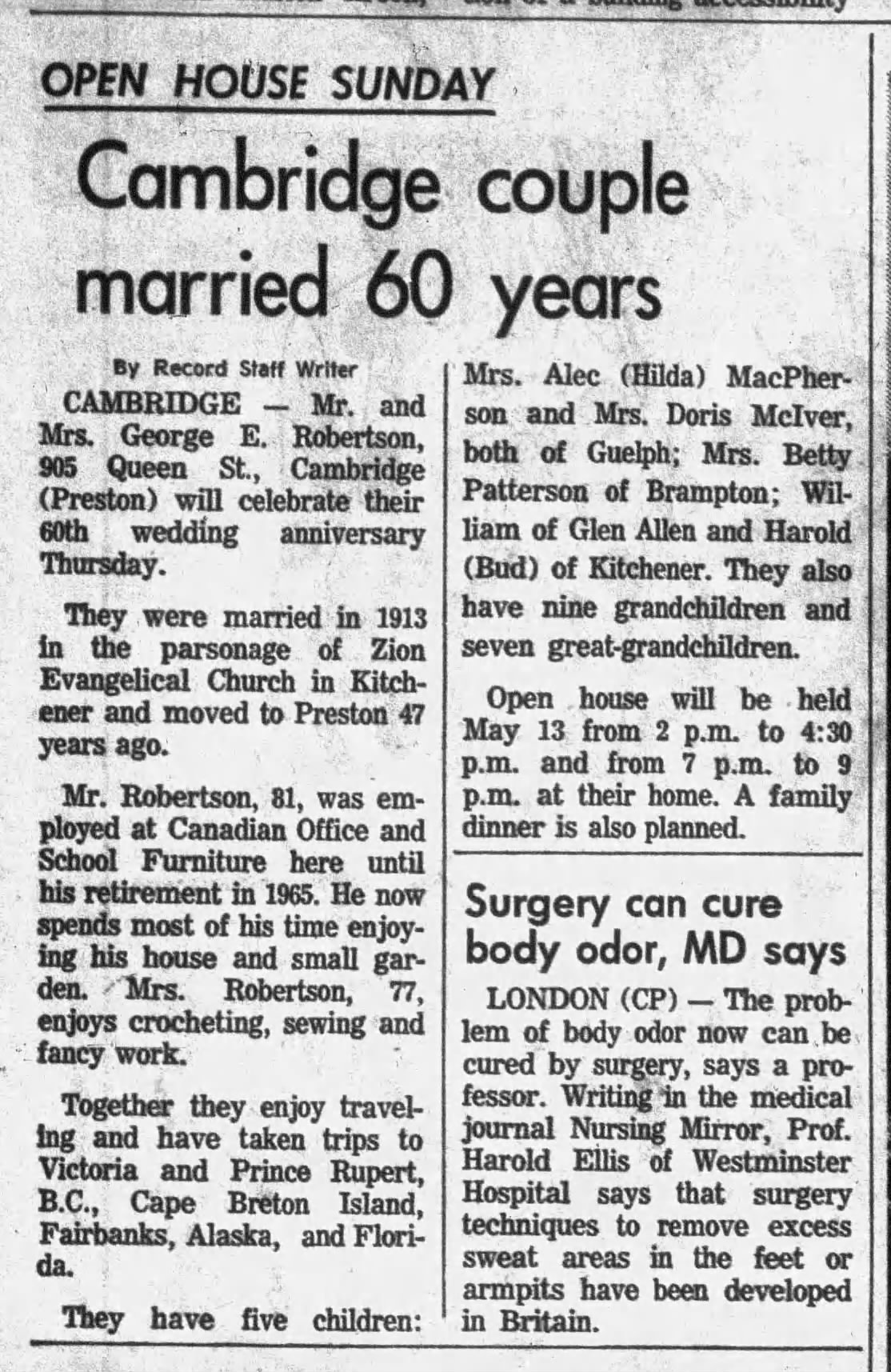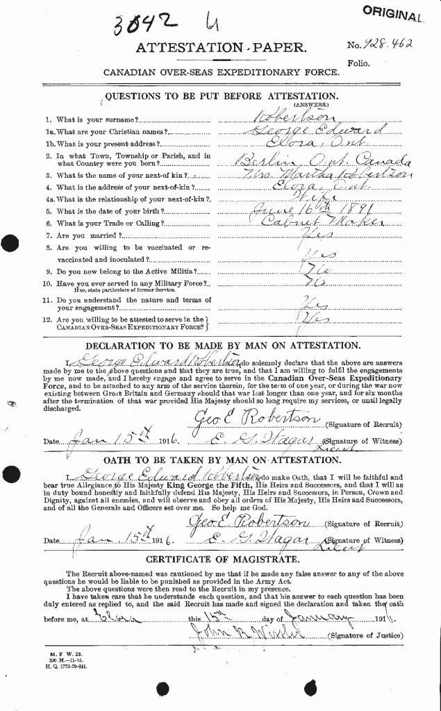 Family Search: When Private George Edward Robertson was born on 16 June 1891, in Kitchener, Waterloo, Ontario, Canada, his father, George Charles Marr Stophani Robertson, was 24 and his mother, Lydia Heyer, was 23. He married Martha Heiser on 9 May 1913, in Kitchener, Waterloo, Ontario, Canada. They were the parents of at least 2 sons and 4 daughters. He lived in Ontario, Canada in 1891 and Preston, Waterloo, Ontario, Canada in 1931. He registered for military service in 1916. In 1916, at the age of 25, his occupation is listed as cabinet maker. He died on 21 November 1979, in Cambridge, Waterloo, Ontario, Canada, at the age of 88, and was buried in Parklawn Cemetery, Cambridge, Waterloo, Ontario, Canada.
