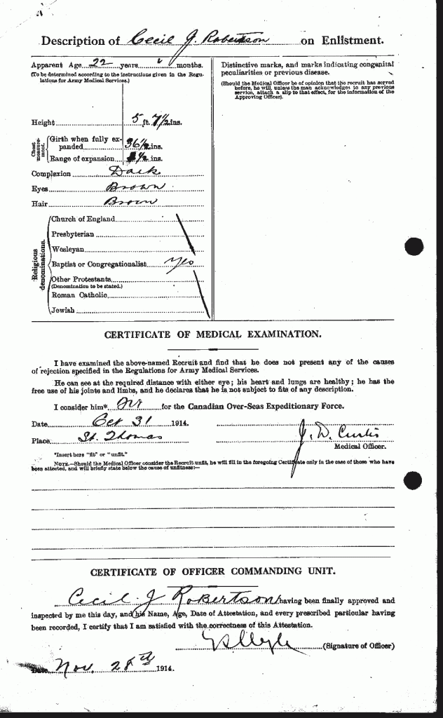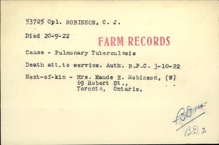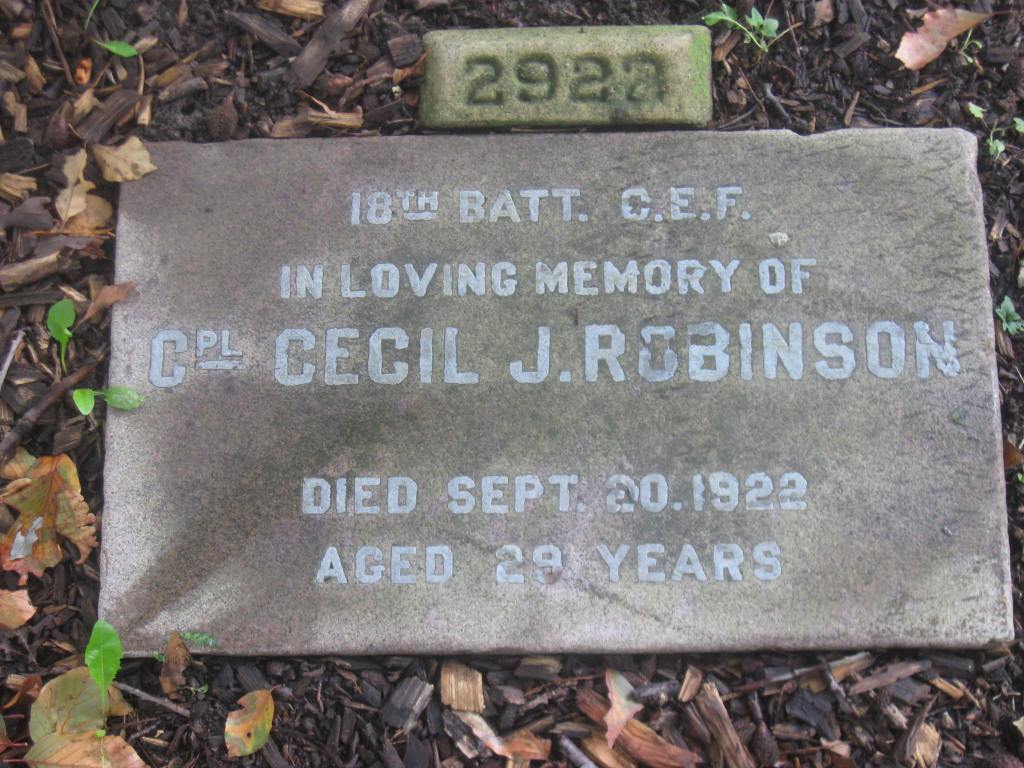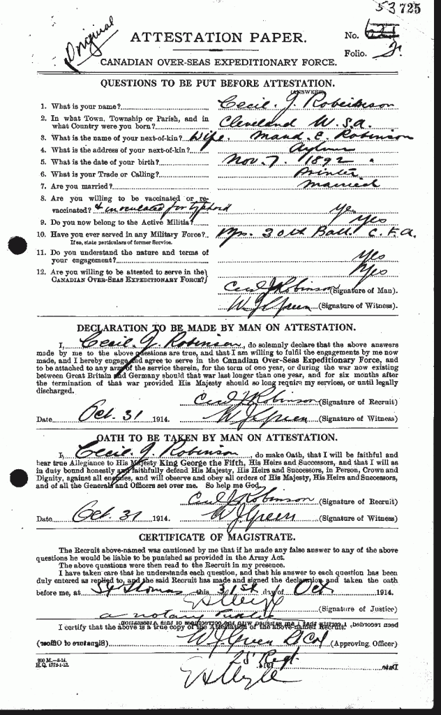 Robinson, Cecil John: Service no. 53725 Digitized Service Record Source: 18th Battalion Nominal Roll, April 1915. American Citizen. Find-A-Grave Family Search His wife, Maud Ethel (Hudson) Robinson. Share this: Click to email a link to a friend (Opens in new window) Email Click to share on Facebook (Opens in new window) Facebook Click to share on X (Opens in new window) X Click to share on Reddit (Opens in new window) Reddit Click to share on LinkedIn (Opens in new window) LinkedIn Click to print (Opens in new window) Print Click to share on Tumblr (Opens in new window) Tumblr Click to share on Pocket (Opens in new window) Pocket Click to share on Pinterest (Opens in new window) Pinterest Click to share on Telegram (Opens in new window) Telegram Click to share on WhatsApp (Opens in new window) WhatsApp Like Loading...