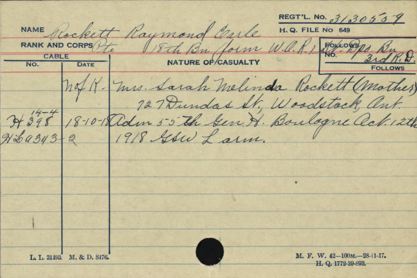 Family Search: When Private Raymond Earl Rockett Sr. was born on 23 August 1896, in Culloden, Oxford, Ontario, Canada, his father, Charles Rockett, was 52 and his mother, Sarah Malinda Griswold, was 48. He married Hannah Mary Elizabeth Butler on 21 November 1923, in Woodstock, Oxford, Ontario, Canada. They were the parents of at least 1 son. He lived in Burgessville, Oxford, Ontario, Canada in 1922 and Norwich Township, Oxford, Ontario, Canada in 1931. He registered for military service in 2019. In 1918, at the age of 22, his occupation is listed as farmer in Burgessville, Oxford, Ontario, Canada. He died in 1974, at the age of 78, and was buried in Burgessville Baptist Cemetery, Burgessville, Oxford, Ontario, Canada.