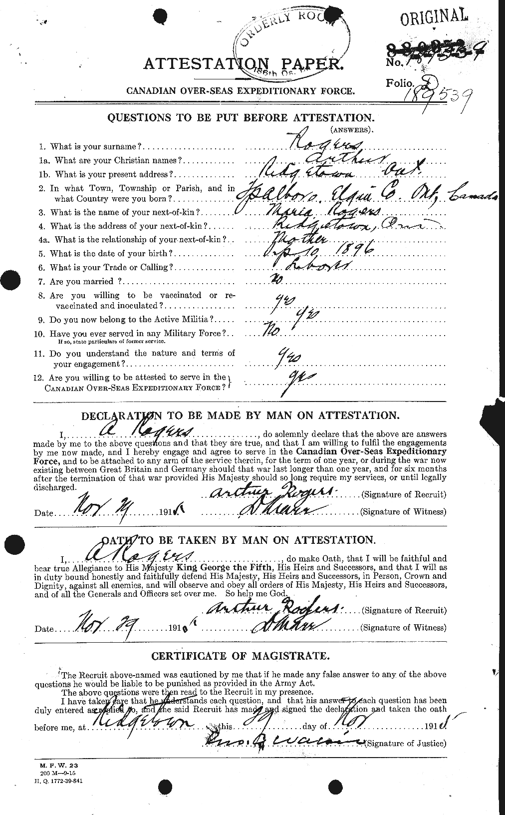 Rogers, Arthur: Service no. 189539 Digitized Service Record Source: Per post at 18th Battalion Facebook Group by Allan Miller. Find-A-Grave Gathering Our Heroes Rogers, Arthur: Service no. 189539. Via Gathering Our Heroes. Share this: Click to email a link to a friend (Opens in new window) Email Click to share on Facebook (Opens in new window) Facebook Click to share on X (Opens in new window) X Click to share on Reddit (Opens in new window) Reddit Click to share on LinkedIn (Opens in new window) LinkedIn Click to print (Opens in new window) Print Click to share on Tumblr (Opens in new window) Tumblr Click to share on Pocket (Opens in new window) Pocket Click to share on Pinterest (Opens in new window) Pinterest Click to share on Telegram (Opens in new window) Telegram Click to share on WhatsApp (Opens in new window) WhatsApp Like Loading...