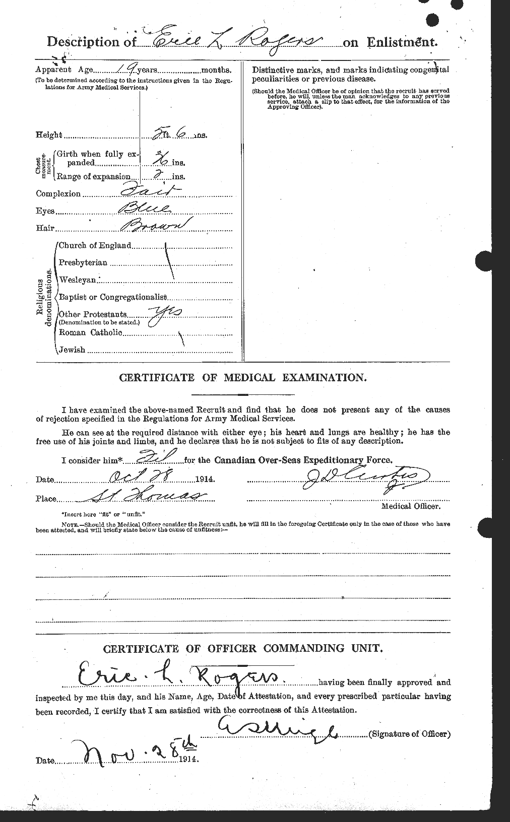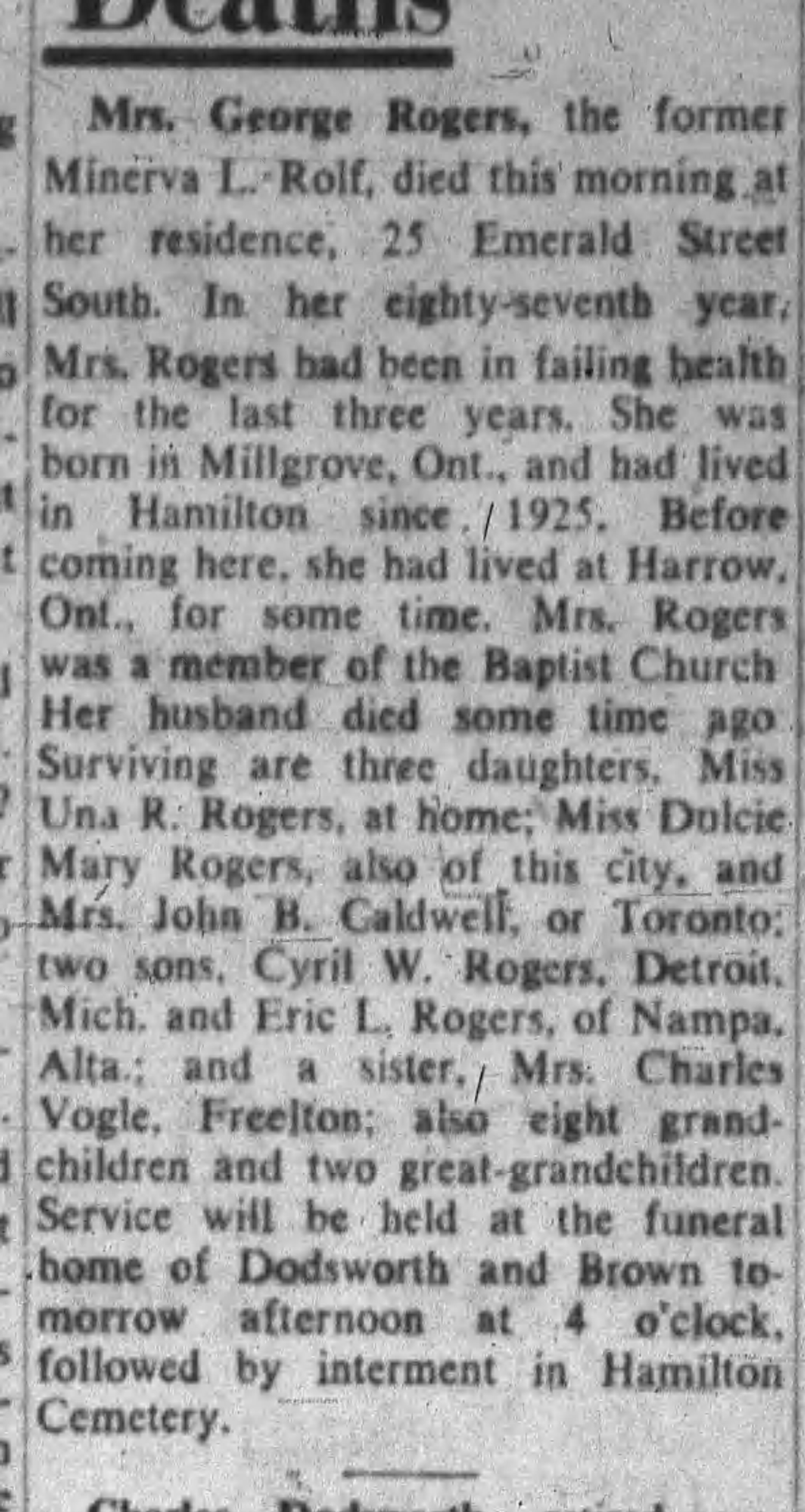 Family Search: When Sergeant Eric Langland Rogers was born on 24 December 1895, in Owen Sound, Grey, Ontario, Canada, his father, George Rogers, was 32 and his mother, Minerva Loretta Rolfe, was 31. He immigrated to Vermont, United States in 1895 and lived in Essex, Ontario, Canada for about 10 years and Peace River, Alberta, Canada for about 5 years. He registered for military service in 1914. In 1931, at the age of 36, his occupation is listed as grain buyer in Peace River, Alberta, Canada. He died on 13 October 1967, in Nampa, Northern Sunrise County, Alberta, Canada, at the age of 71.