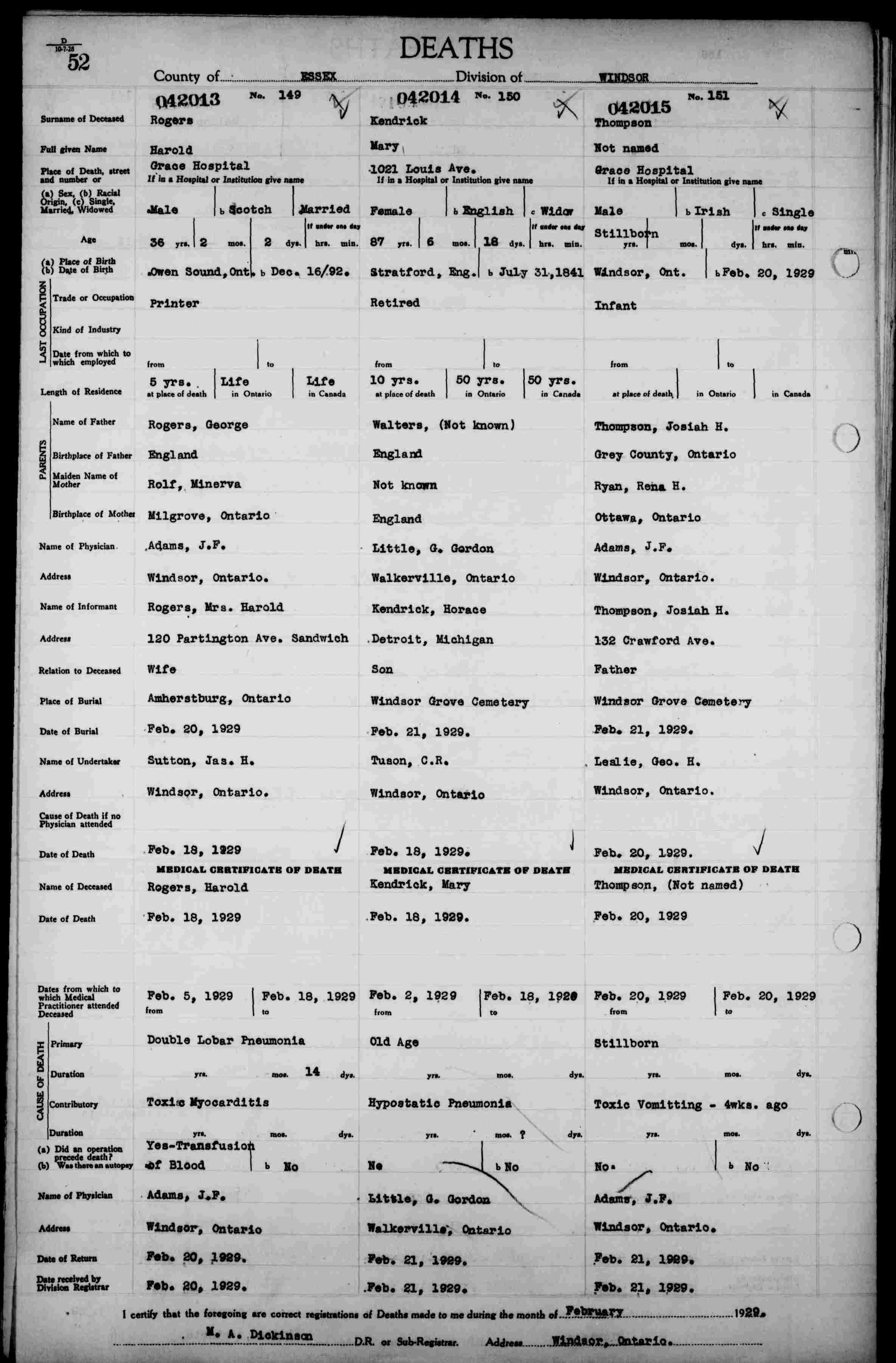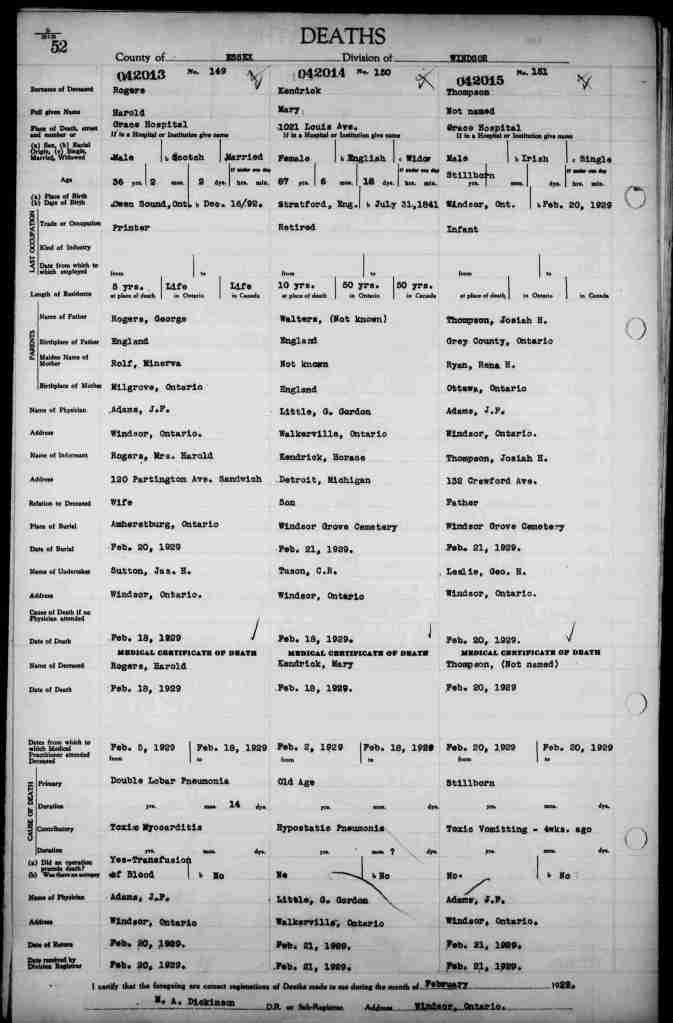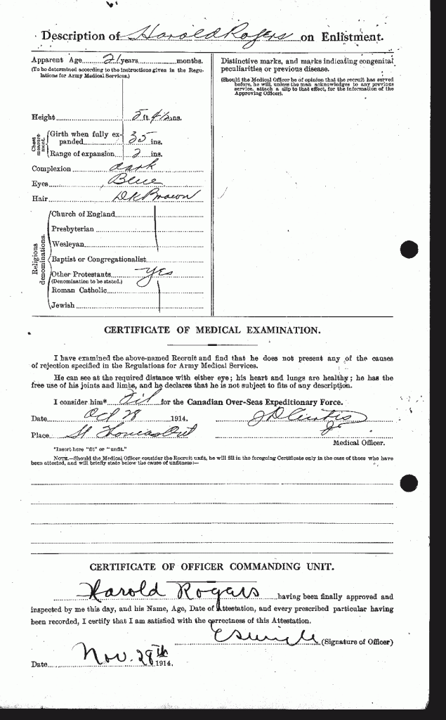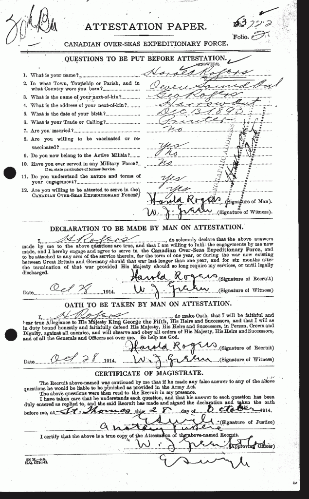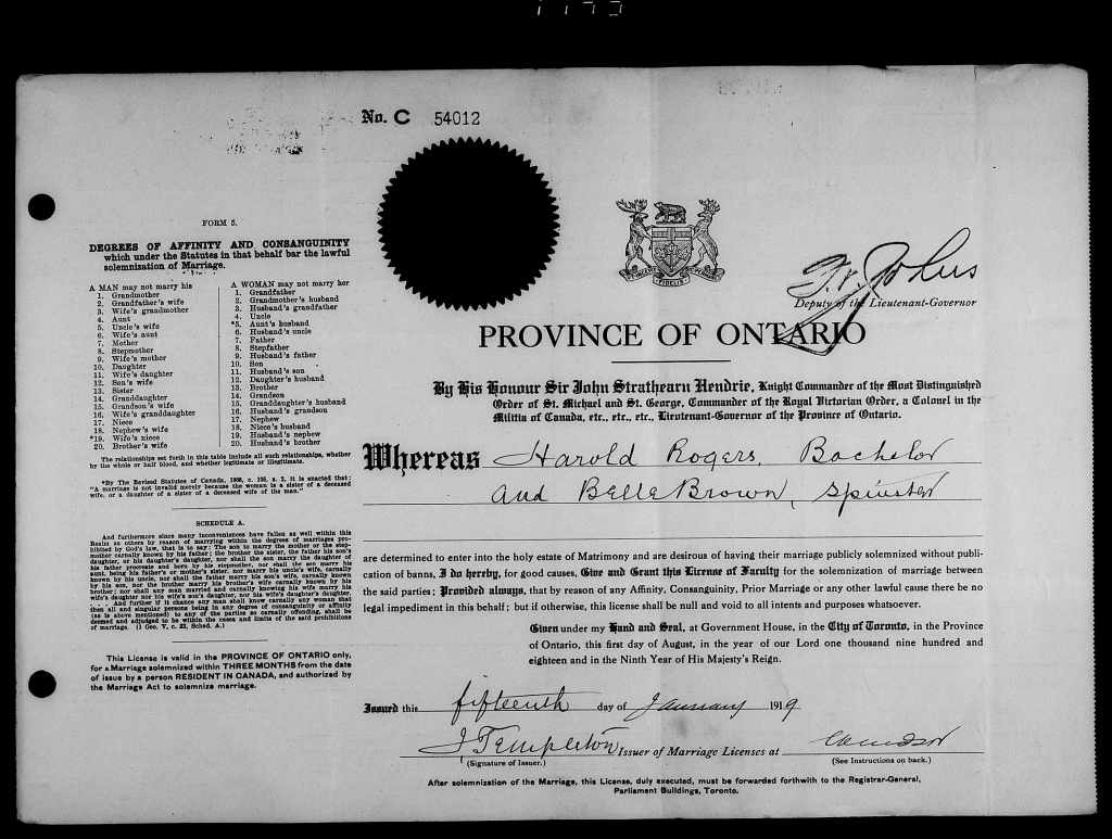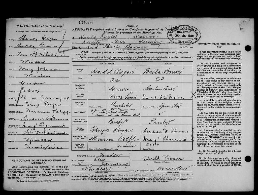 Family Search: When Harold Rogers was born on 13 December 1892, in Owen Sound, Grey, Ontario, Canada, his father, George Rogers, was 29 and his mother, Minerva Loretta Rolfe, was 28. He married Bell Brown on 15 January 1919, in Windsor, Essex, Ontario, Canada. He lived in Essex, Ontario, Canada for about 10 years and Peace River, Alberta, Canada in 1921. He registered for military service in 1914. In 1914, at the age of 22, his occupation is listed as printer, st. thomas daily times in St. Thomas, Elgin, Ontario, Canada. He died on 18 February 1929, in Owen Sound, Grey, Ontario, Canada, at the age of 36, and was buried in Rose Hill Cemetery, Amherstburg, Essex, Ontario, Canada.