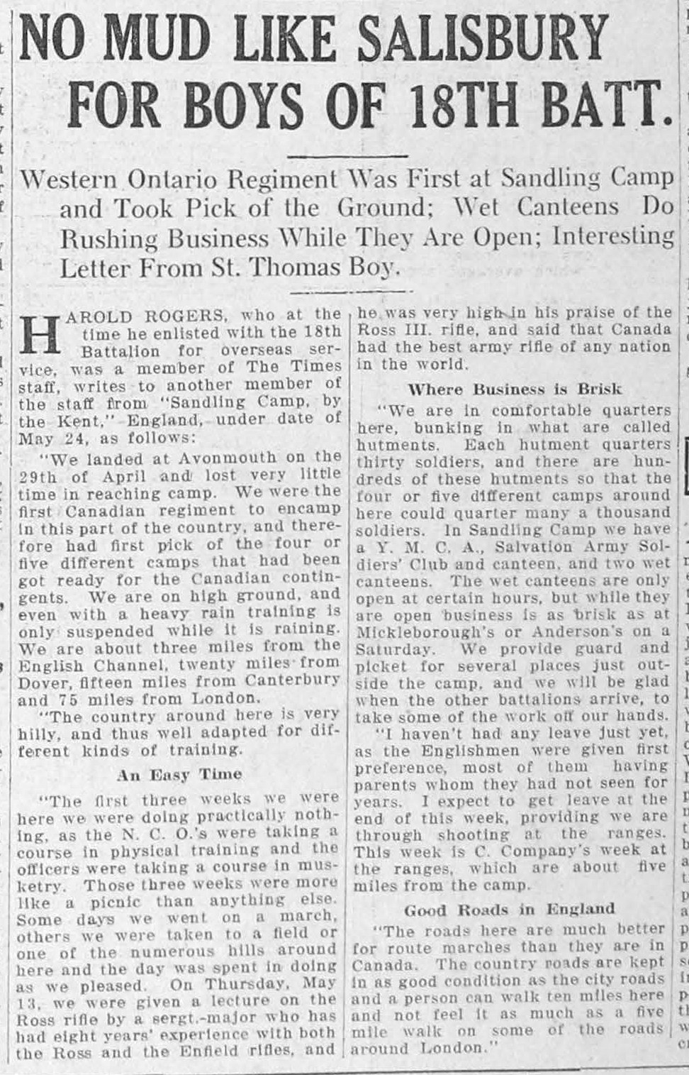 “A great obituary in the Border Cities Star on the date of his death Feb. 28, 1929 shows he came to Amherstburg with his parents George and Minerva Loretta (Rolph) Rogers, learning to be a linotype operator in his father’s business in Harrow, then Chicago, and Peace River, Alberta newspaper, In WWI, he enlisted 28 Oct. 1914 in the 18th Battalion, Regimental Number 53722, fought overseas in France with the 20th, returned 30 Dec 1918, married 16 Jan 1919 to Belle Brown and discharged 31 Jan. 1919 as Cpl. After the war, he worked at the Windsor Star until his death from pneumonia leaving his wife Belle (nee Brown) and a son who would become Dr. Donald Rogers in Burlington.”
