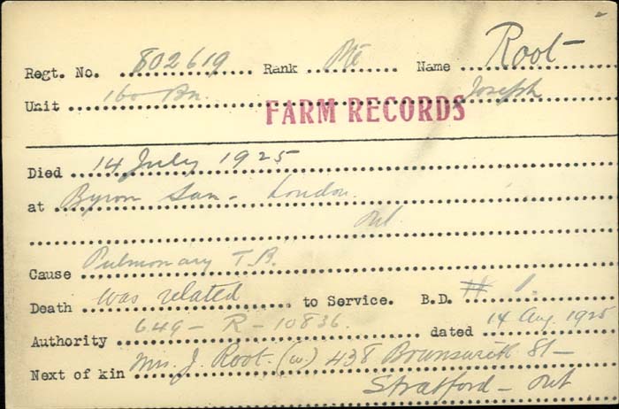 Family Search: When Private Joseph Root was born on 24 July 1887, in Saugeen, Bruce, Ontario, Canada, his father, Jesse Issac Root, was 22 and his mother, Margaret Wabazee, was 27. He married Eleanor Shields on 10 February 1919, in Bruce, Ontario, Canada. They were the parents of at least 2 daughters. He lived in Bruce, Ontario, Canada for about 10 years. He registered for military service in 1915. In 1915, at the age of 28, his occupation is listed as farmer. He died on 14 July 1925, in London, Ontario, Canada, at the age of 37, and was buried in French Bay Cemetery, Saugeen Shores, Bruce, Ontario, Canada
