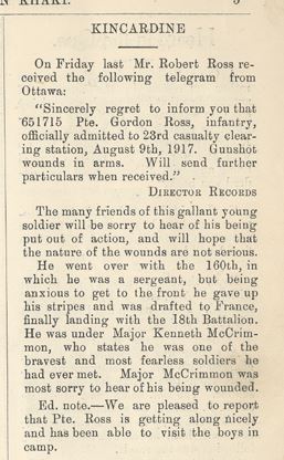 “Sincerely regret to inform you that 651715 Pte. Gordon Ross, infantry, officially admitted to 23rd casualty clearing station, August 9th, 1917. Gunshot wounds in arms. Will send further particulars when received.”