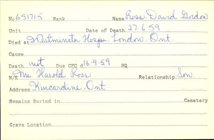 Family Search: When Private David Gordon Ross was born on 5 July 1896, in Wroxeter, Huron, Ontario, Canada, his father, Robert Ross, was 23 and his mother, Margaret Gordon McKay, was 25. He married Jenetta Ione Taylor on 17 July 1922, in Ontario, Canada. They were the parents of at least 3 sons and 2 daughters. He lived in Kincardine, Bruce, Ontario, Canada in 1931. He registered for military service in 1916. In 1916, at the age of 20, his occupation is listed as engineer. He died on 27 June 1959, in London, Ontario, Canada, at the age of 62, and was buried in Kincardine Cemetery, Kincardine, Bruce, Ontario, Canada.