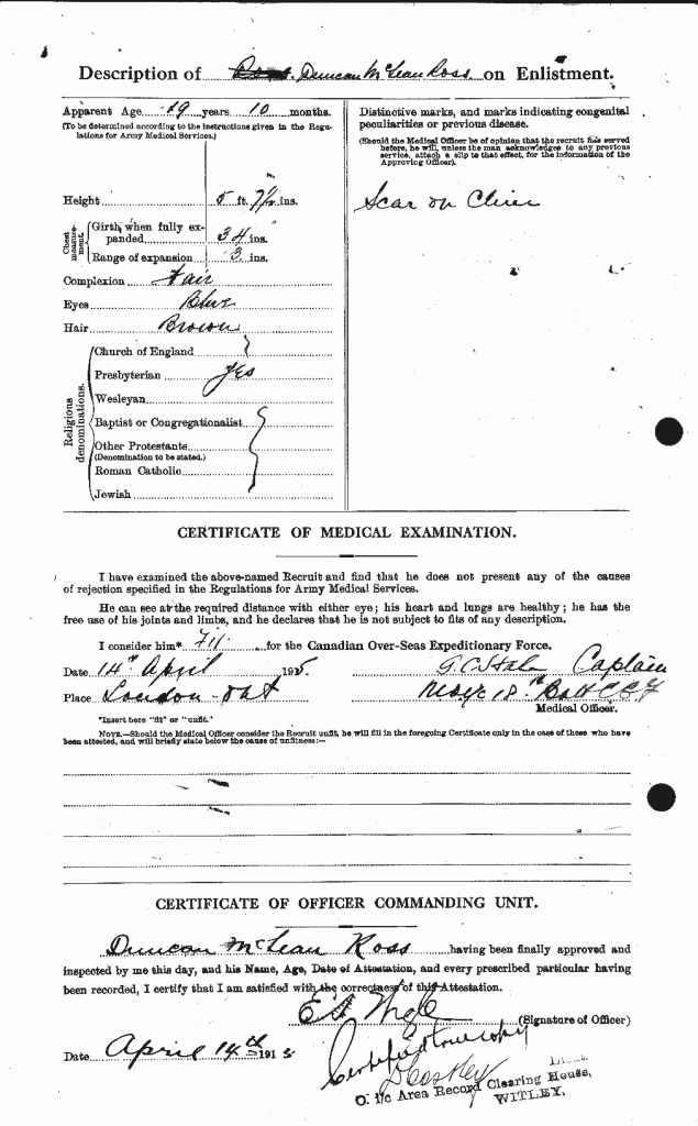 Family Search: When Sergeant Duncan McLean Ross was born on 9 June 1895, in Stratford, Perth, Ontario, Canada, his father, Donald Ross, was 38 and his mother, Mary Ann Ross, was 32. He lived in Perth, Ontario, Canada for about 10 years. He registered for military service in 1915. In 1915, at the age of 20, his occupation is listed as stenographer in Stratford, Perth, Ontario, Canada. He died in October 1976, at the age of 81, and was buried in Avondale Cemetery, Stratford, Perth, Ontario, Canada.