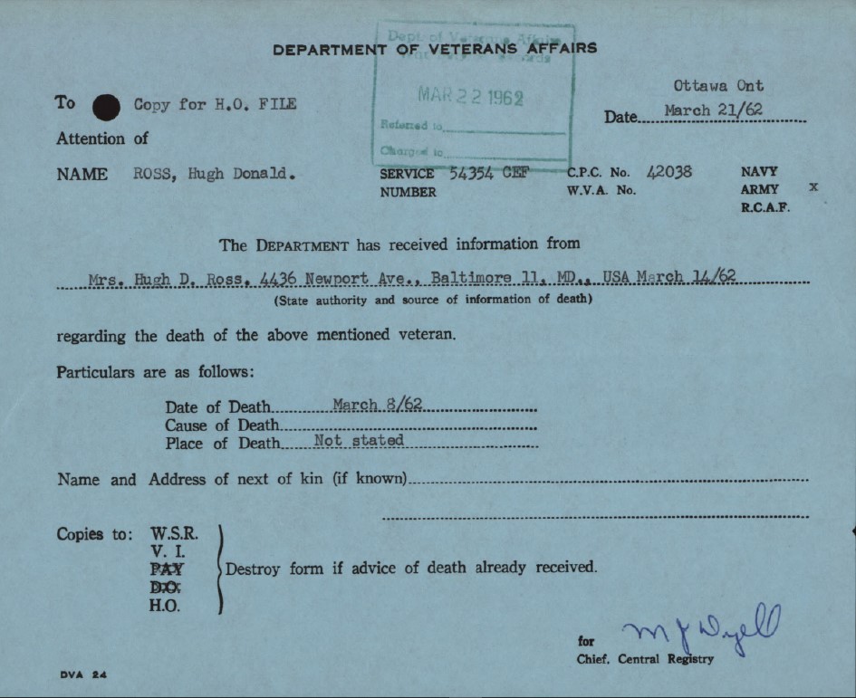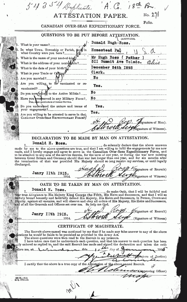 Born U.S.A. May have some connection to Private Walter George Ross, reg. no. 54353 also joined and served in the 18th Battalion. W.G. Ross enlisted under an assumed name and many not be related. It also puts some concern to the veracity of the attesation information given by this soldier.