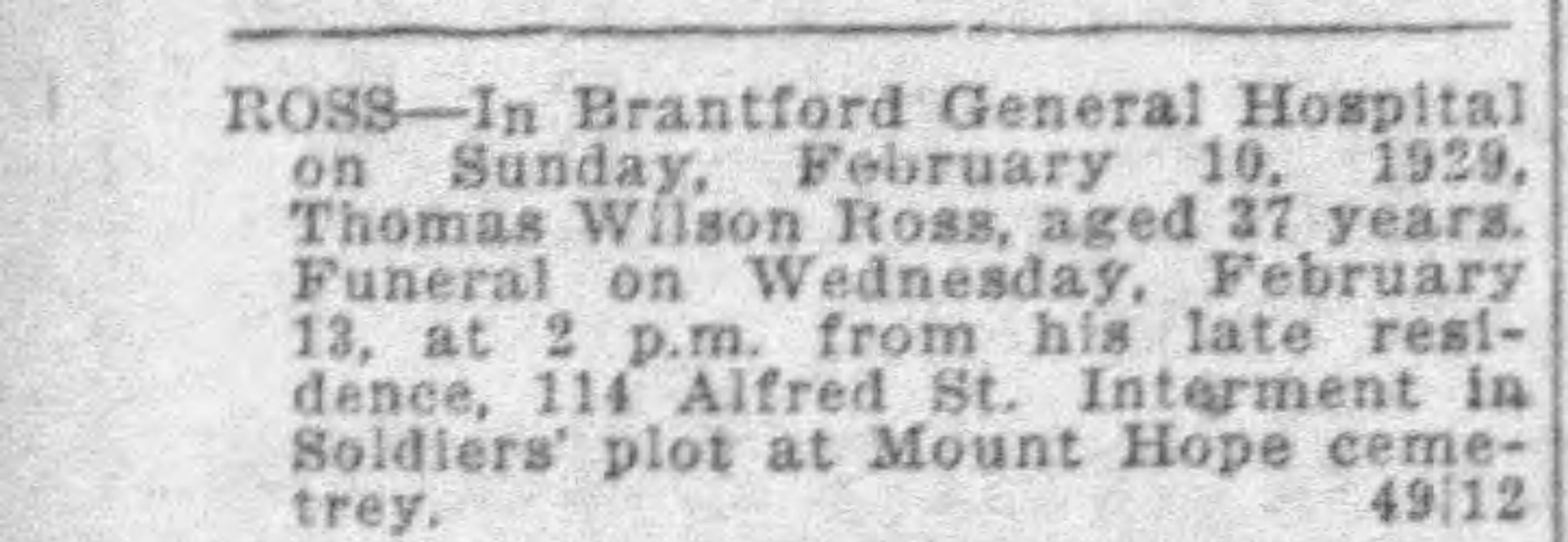 The funeral of Thomas Wilson Ross was held yesterday afternoon from the residence, 114 Alfred Street to Mount Hope cemetery, where interment took place in the Soldiers’ Plot. Mrs. George Corman sang a solo at the home and the services at the home and graveside were in charge of Rev. Dr. A.T. Barr, minister of Central Presbyterian church. Last Post was sounded over the grave by Bugler J. Beckham and the pallbearers, all former comrades of the deceased overseas were Alex Ramsay, T. Weller, G. Meikle, G. Marshall, A. Ormiston and J. McGuinness.