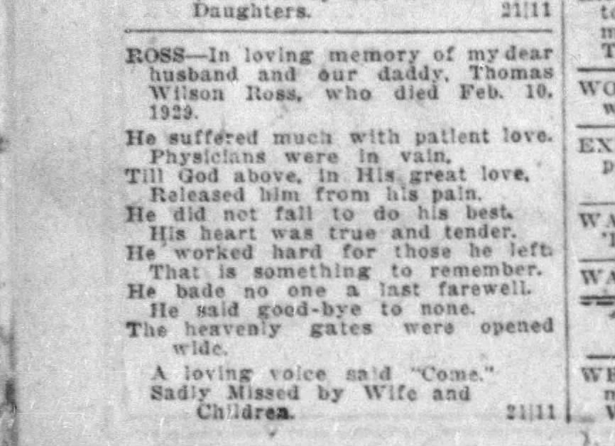 Thomas W. Ross, well-known local veteran, died in the hospital yesterday at the age of 37. Mr. Ross joined the 10th Brant Dragoons in 1915, transferred to the 18th Overseas Infantry Battalion and served at the front to the end of the war, more than two and a half years. He was once wounded. Beside his widow he leaves two children, Jessie and Agnes. The funeral will be held on Wednesday from the home, 114 Alfred Street, with interment in the Soldiers’s plot in Mount Hope cemetery.