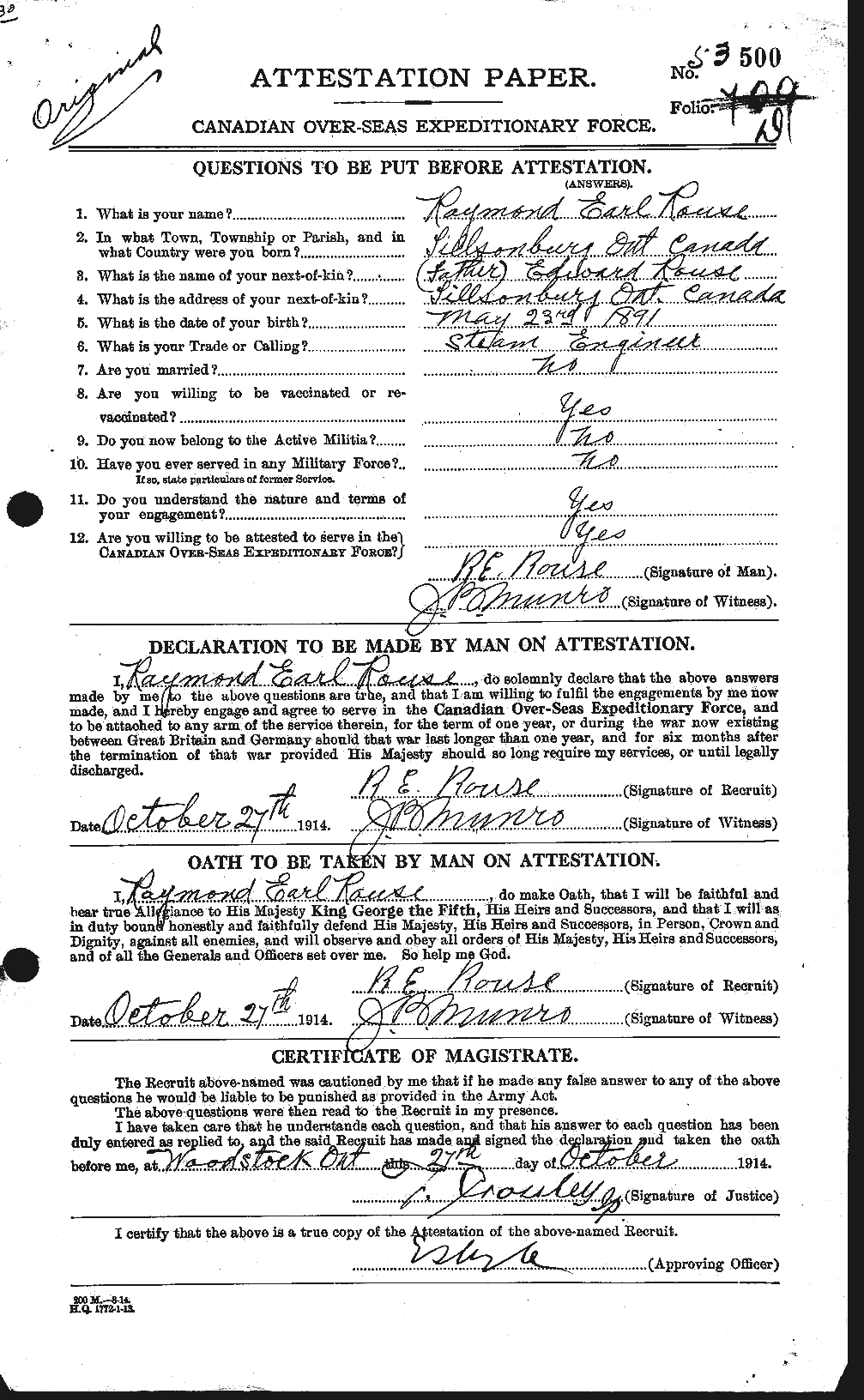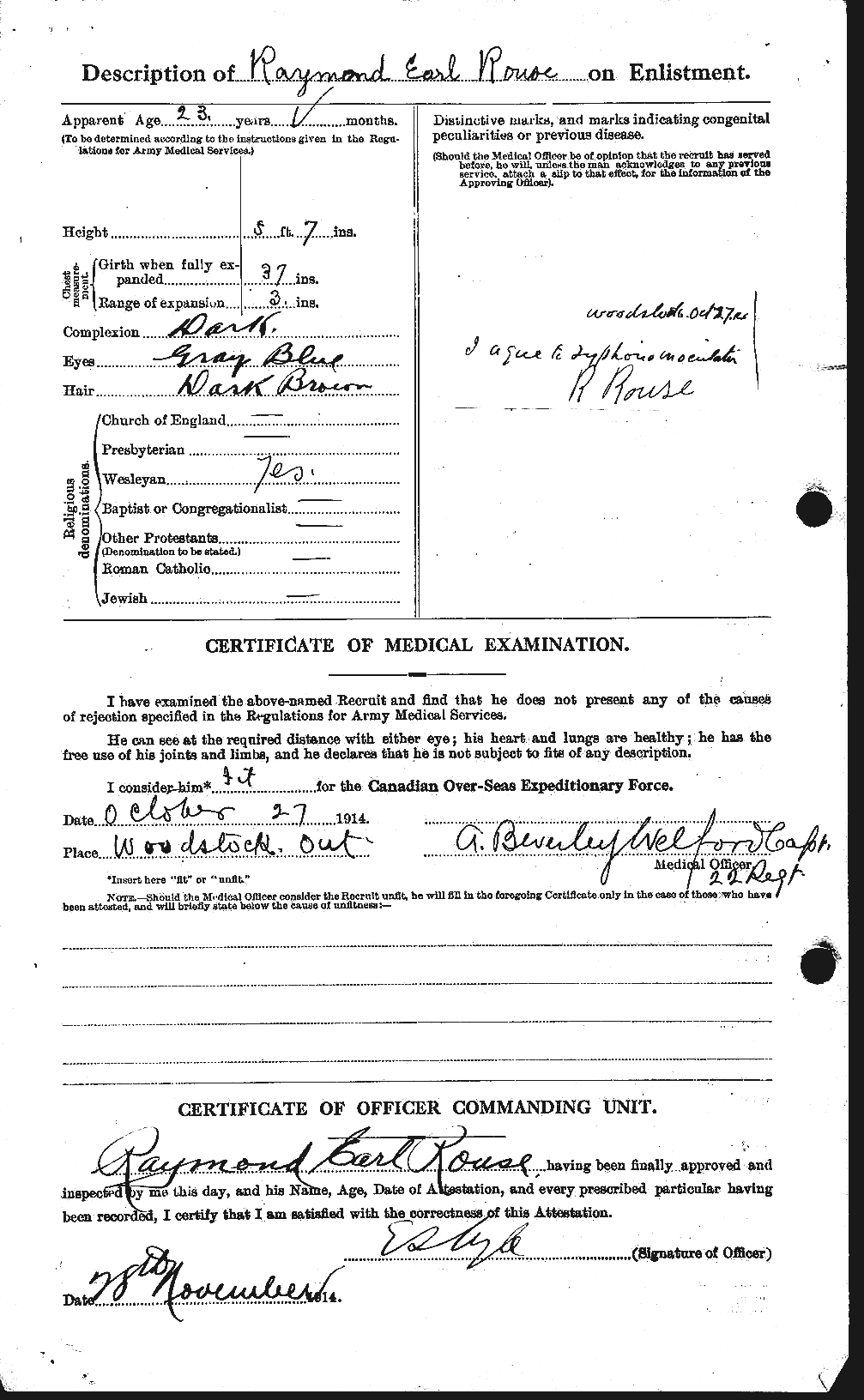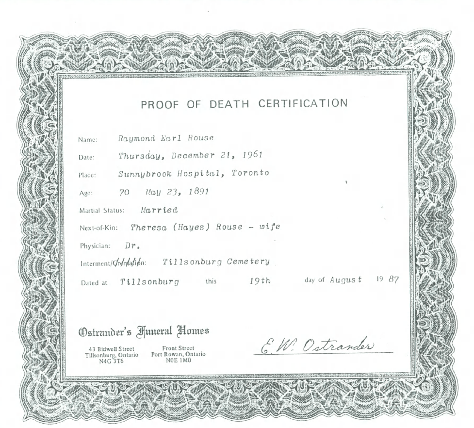 Family Search: When Lieutenant Raymond Earle Rouse was born on 23 May 1891, in Tillsonburg, Oxford, Ontario, Canada, his father, Edward George Rouse, was 29 and his mother, Charity Weeks, was 23. He had at least 1 son and 1 daughter with Theresa Ann Hayes. He immigrated to Buffalo, Erie, New York, United States in 1926 and lived in Norfolk, Ontario, Canada in 1901 and Oxford, Ontario, Canada in 1911. He registered for military service in 1914. He died on 21 December 1961, in Toronto, Ontario, Canada, at the age of 70, and was buried in Tillsonburg, Oxford, Ontario, Canada.