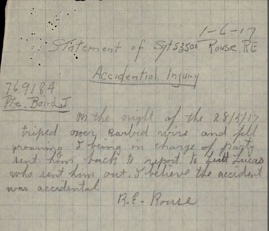 Source: Service Record of Pte. James Baird, reg. no. 769184. See note written by Sergeant Rouse regarding accidental injury.