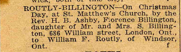Family Search: When William Frederick Routly was born on 21 January 1896, in Paddington, London, England, United Kingdom, his father, William Henry Routly, was 43 and his mother, Fanny Jane Chapman, was 35. He married Florence Billington on 21 December 1919, in London, Ontario, Canada West, British Colonial America. They were the parents of at least 3 daughters. He lived in Islington, London, England, United Kingdom in 1901. He died on 8 August 1974, in London, Ontario, Canada West, British Colonial America, at the age of 78, and was buried in Saint Anne’s Anglican Church Cemetery, London, Ontario, Canada.