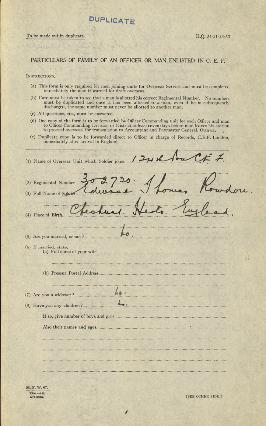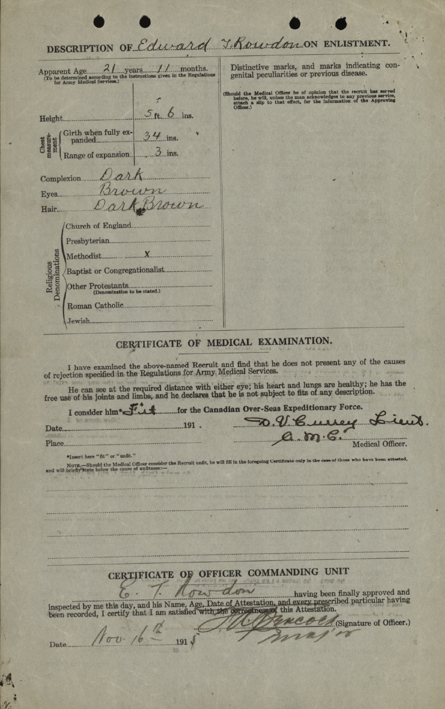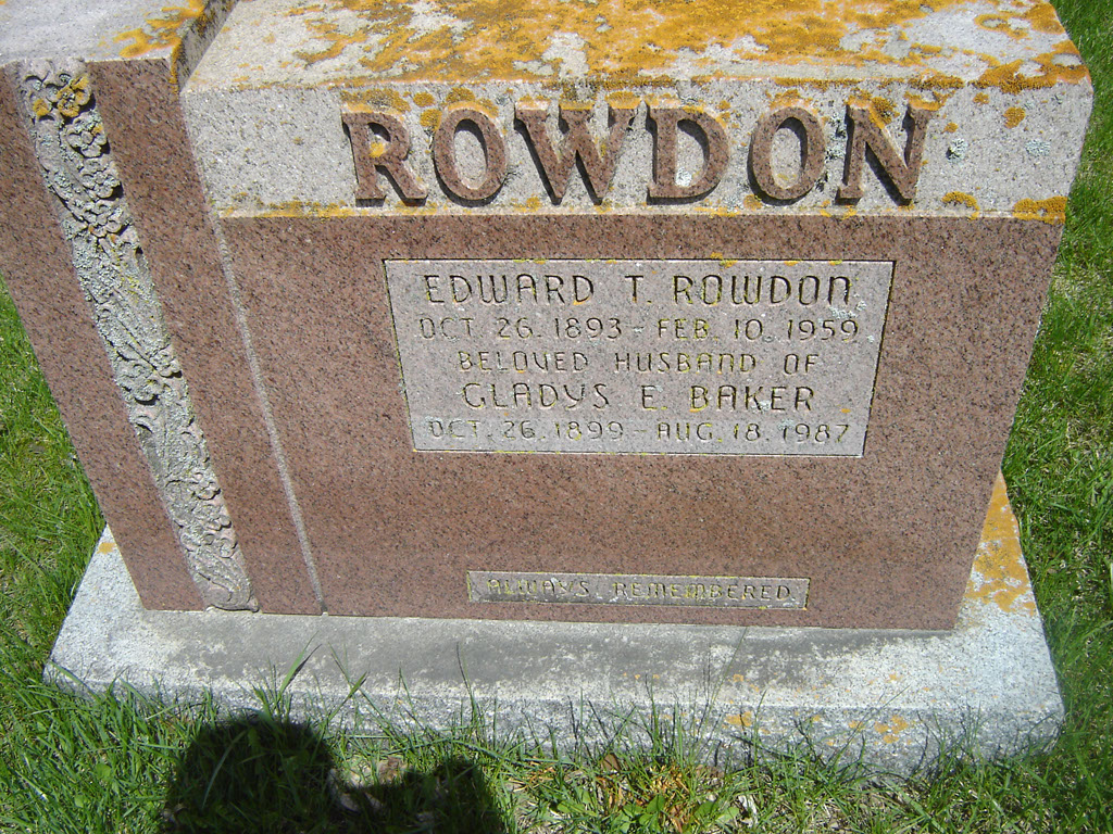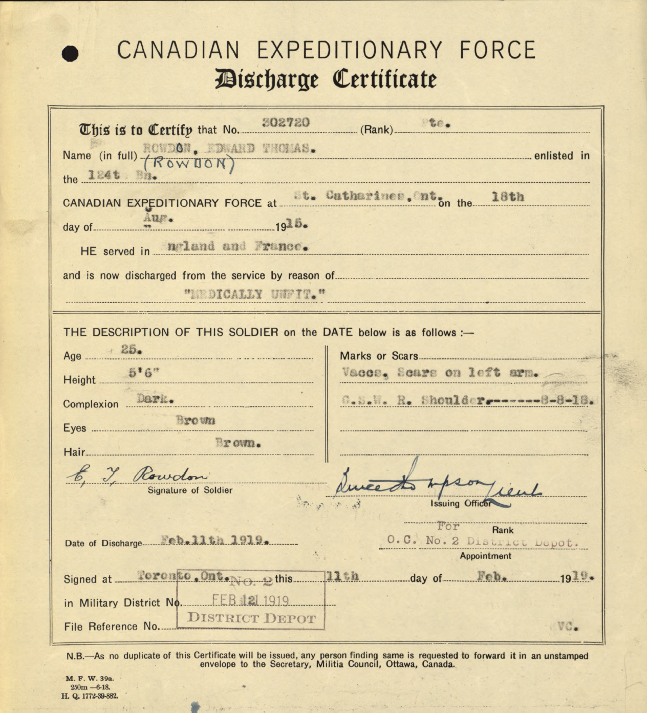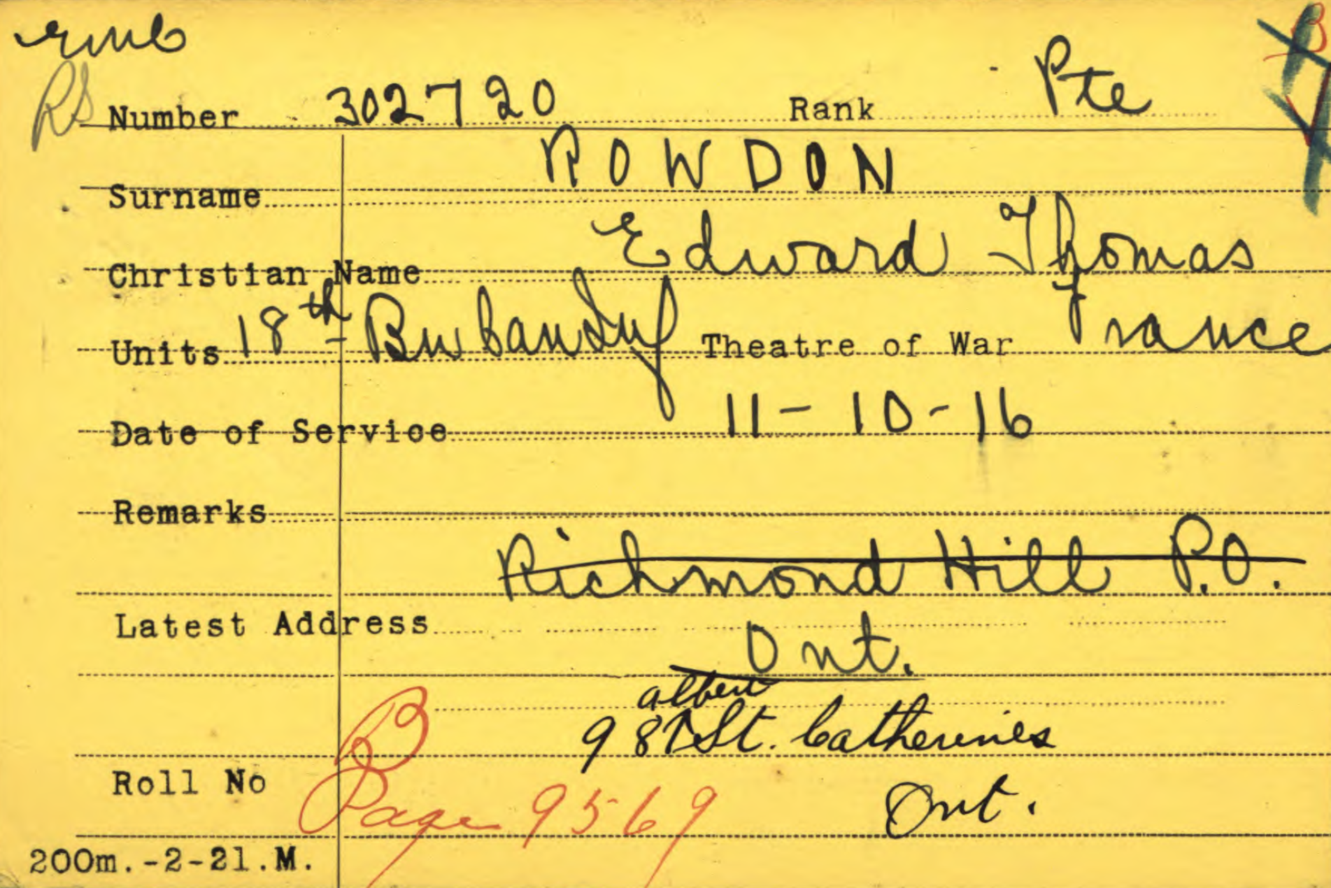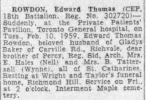 Family Search: When Private Edward Thomas Rowdon was born on 26 October 1893, in Cheshunt, Hertfordshire, England, United Kingdom, his father, Charles Henry Rowden, was 25 and his mother, Ellen Rowlinson, was 24. He married Gladys Emily Baker on 14 August 1919, in St. Catharines, Lincoln, Ontario, Canada. He lived in Middlesex, England, United Kingdom in 1911. He registered for military service in 1915. In 1915, at the age of 22, his occupation is listed as clerk in St. Catharines, Lincoln, Ontario, Canada. He died on 10 February 1959, in Toronto, Ontario, Canada, at the age of 65, and was buried in Maple Cemetery, Maple, York, Ontario, Canada.