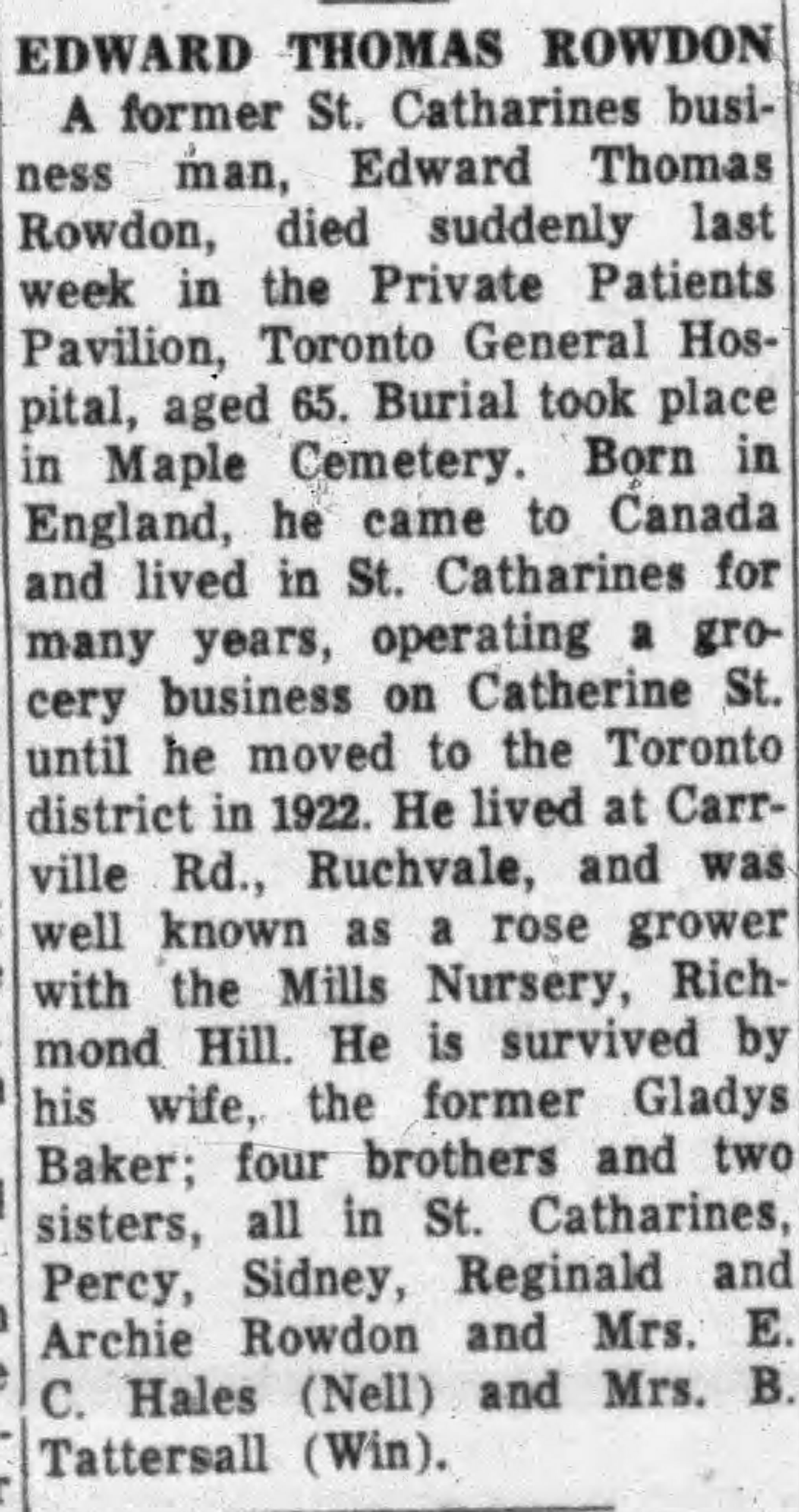 A former St. Catharines business man, Edward Thomas Rowdon, died suddenly last week in the Private Patients Pavilion, Toronto General Hospital, aged 65. Burial took place in Maple Cemetery. Born in England, he came to Canada and lived in St. Catharines for many years, operating a grocery business on Catherine St. until he moved to the Toronto district in 1922. He lived at Carrville Rd., Richvale, and was well known as a rose grower with the Mills Nursery, Richmond Hill. He is survived by his wife, the former Gladys Baker; four brothers and two sisters, all in St. Catharines, Percy, Sidney, Reginald and Archie Rowdon and Mrs. E. C. Hales (Nell) and Mrs. B. Tattersall (Win).