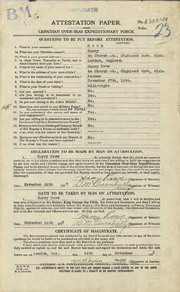 Family Search: When Harry Rowe Jr. was born on 27 November 1896, in London, England, United Kingdom, his father, Harry Rowe, was 17 and his mother, Isabell C. Taylor, was 30. He had at least 1 son and 2 daughters with Mary Ellen Burns. He lived in Wandsworth, London, England, United Kingdom in 1901. He died on 10 March 1955, in London, Ontario, Canada, at the age of 58.