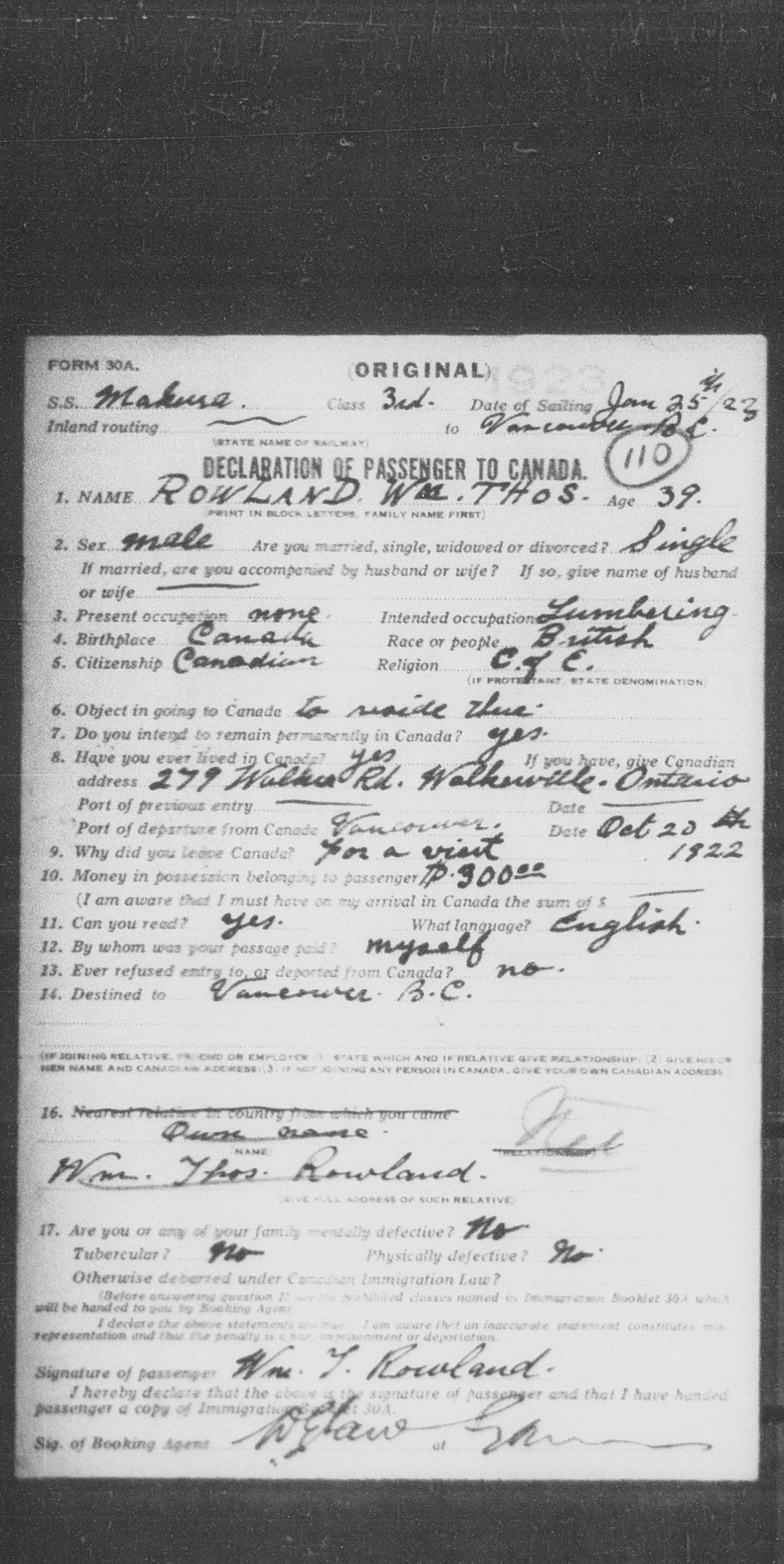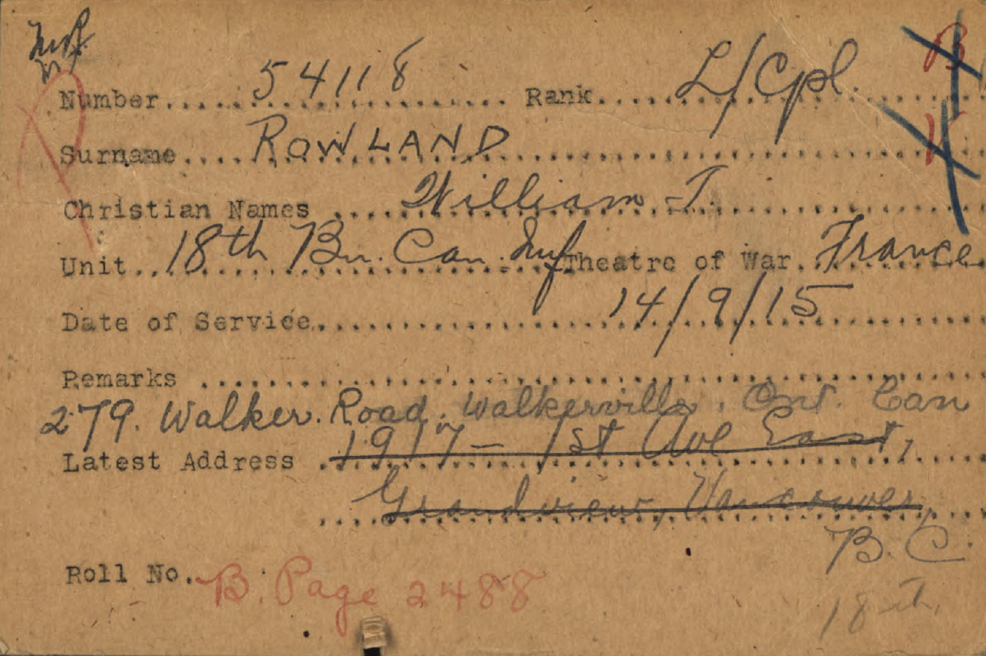 Family Search: When Private William Thomas Rowland was born on 31 October 1883, in South Easthope Township, Perth, Ontario, Canada, his father, William Rowland, was 55 and his mother, Barbara McColl, was 38. He immigrated to New York, United States in 1931 and lived in Powell River, British Columbia, Canada in 1911. He registered for military service in 1914. In 1914, at the age of 31, his occupation is listed as labourer. He died in July 1959, at the age of 75.