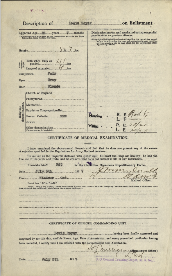 Family Search: Private Louis Royer was born on 15 December 1891, in Quebec City, Quebec, Canada as the son of Louis Royer and Louise. He immigrated to Detroit, Wayne, Michigan, United States in 1916 and lived in Detroit, Wayne, Michigan, United States in 1917 and Saint-Anselme, Ville-Marie, Montreal, Quebec, Canada in 1955. He registered for military service in 1917. In 1917, at the age of 26, his occupation is listed as bricklayer in Detroit, Wayne, Michigan, United States. He died on 31 March 1971, in Sainte-Foy, Quebec City, Quebec, Canada, at the age of 79.