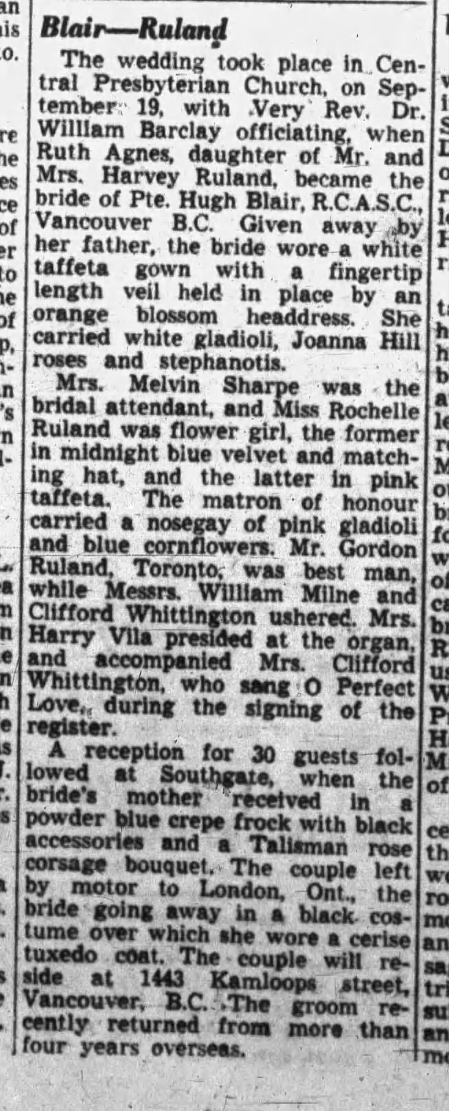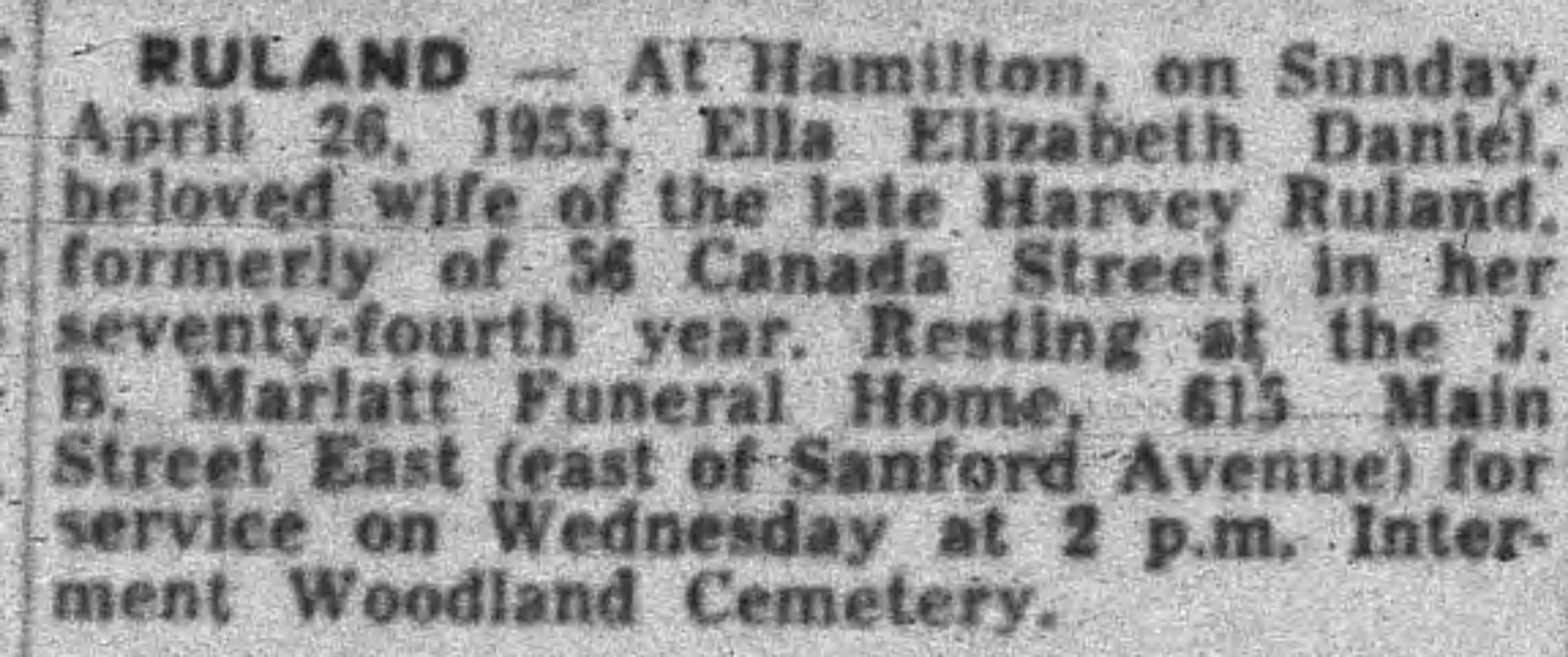 Family Search: When Sergeant Harvey Stuart Ruland was born on 22 May 1885, in Hamilton, Wentworth, Ontario, Canada, his father, George Ruland, was 31 and his mother, Agnes Cassils, was 31. He married Ella Elizabeth Daniels on 6 March 1909, in Hamilton, Hamilton-Wentworth, Ontario, Canada. They were the parents of at least 2 sons and 1 daughter. He lived in Hamilton, Ontario, Canada for about 20 years and Simcoe, Ontario, Canada in 1921. He registered for military service in 1915. In 1915, at the age of 30, his occupation is listed as painter in Hamilton, Wentworth, Ontario, Canada. He died on 22 August 1946, in Hamilton, Wentworth, Ontario, Canada, at the age of 61, and was buried in Woodland Cemetery, Hamilton, Ontario, Canada.