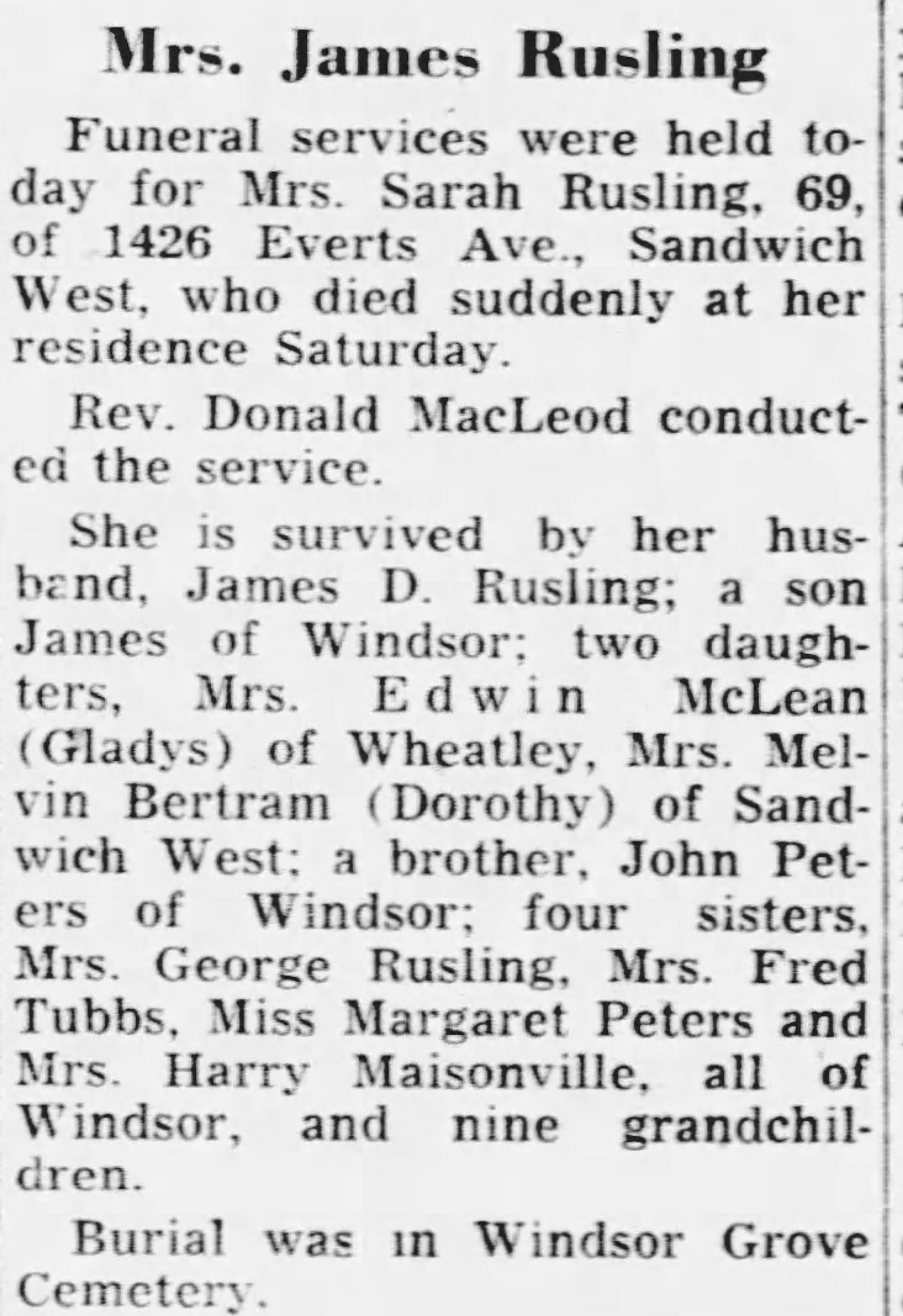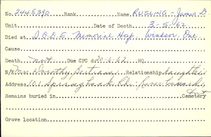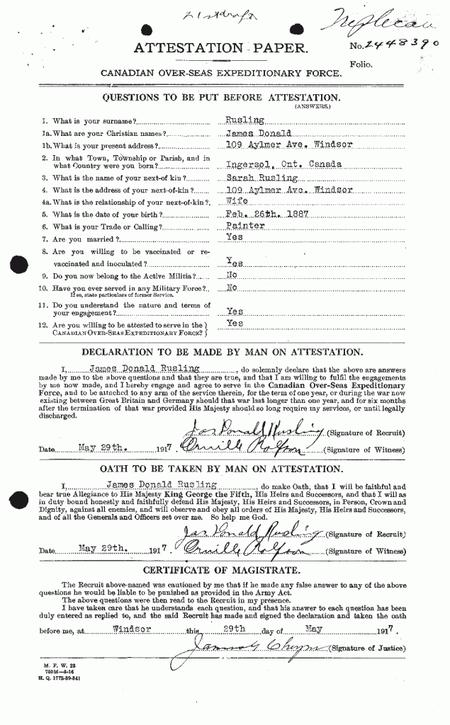 Family Search: When Private James Donald Rusling was born on 26 February 1887, in Ingersoll, Oxford, Ontario, Canada, his father, John Franklin Rusling, was 33 and his mother, Charlotte McKay, was 30. He married Sarah Peters on 22 February 1912, in Windsor, Essex, Ontario, Canada. They were the parents of at least 2 sons and 2 daughters. He lived in North Oxford Township, Oxford, Ontario, Canada in 1891 and Elgin, Ontario, Canada in 1901. He registered for military service in 1917. In 1917, at the age of 30, his occupation is listed as painter. He died on 3 May 1962, in Windsor, Essex, Ontario, Canada, at the age of 75, and was buried in Windsor Grove Cemetery, Windsor, Essex, Ontario, Canada.
