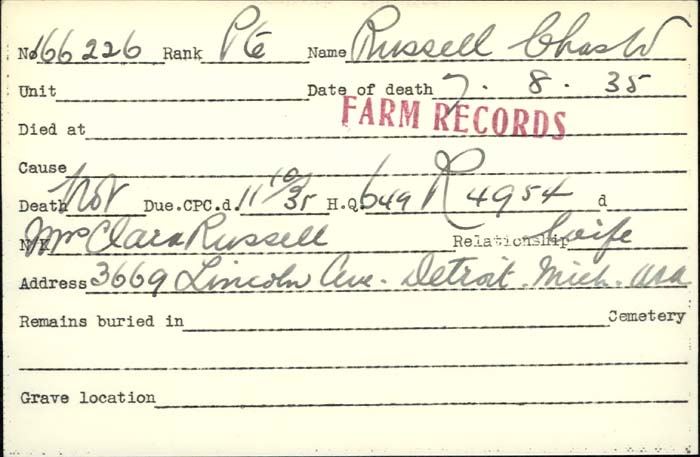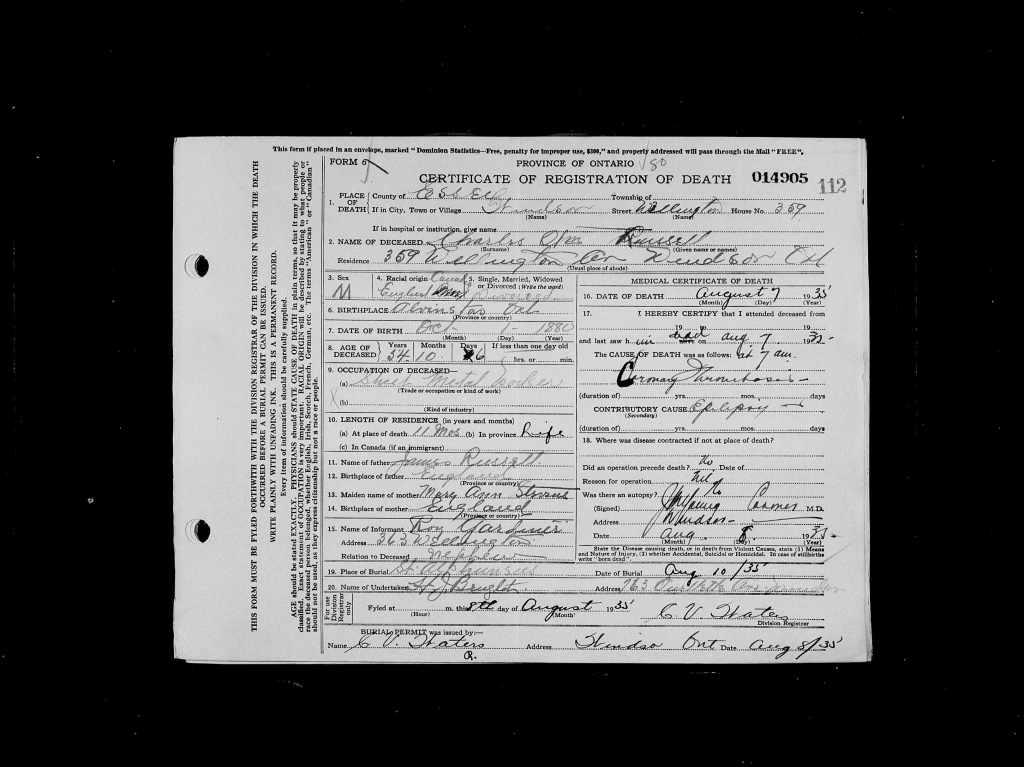 Family Search: When Private Charles William Russell was born on 1 October 1880, in Brooke, Lambton, Canada West, British Colonial America, his father, James Russell, was 35 and his mother, Mary Ann Stevens, was 22. He lived in London, Ontario, Canada in 1915 and Detroit, Wayne, Michigan, United States in 1925. He registered for military service in 1915. In 1937, his occupation is listed as sheetmetal worker in Windsor, Essex, Ontario, Canada. He died on 7 August 1935, in Windsor, Essex, Ontario, Canada, at the age of 54, and was buried in Saint Alphonsus Roman Catholic Cemetery, Windsor, Essex, Ontario, Canada.