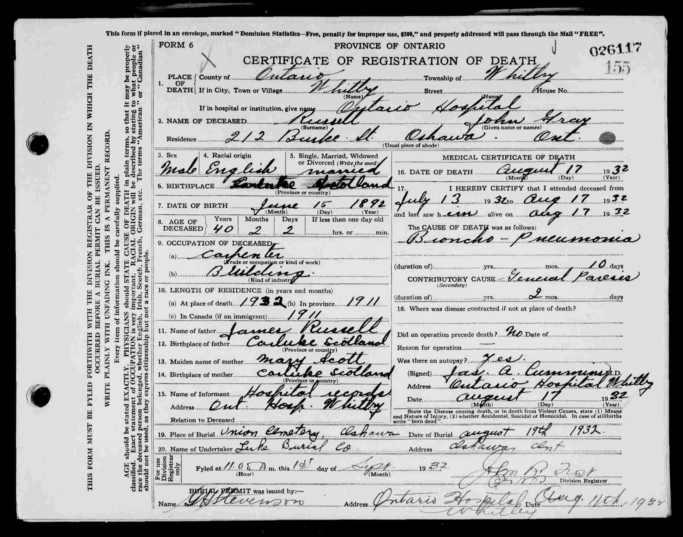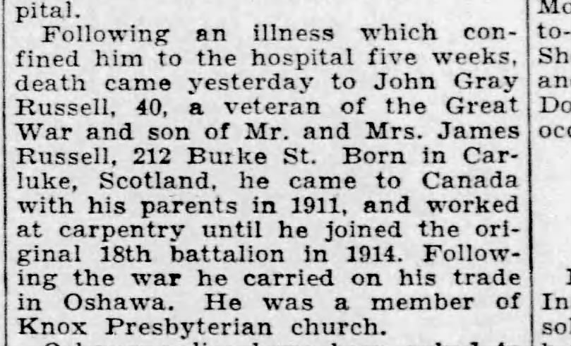 Family Search: When Private John Gray Russell was born on 15 June 1891, in Carluke, Lanarkshire, Scotland, United Kingdom, his father, James Russell, was 30 and his mother, Mary Scott, was 33. He married Louise Davies on 22 June 1925, in Toronto, York, Ontario, Canada. He immigrated to Canada in 1911 and lived in Scotland, United Kingdom in 1891 and Detroit, Wayne, Michigan, United States in 1917. He registered for military service in 1914. In 1914, at the age of 23, his occupation is listed as carpenter. He died on 17 August 1932, in Whitby, Ontario, Ontario, Canada, at the age of 41, and was buried in Oshawa Union Cemetery, Oshawa, Ontario, Ontario, Canada.