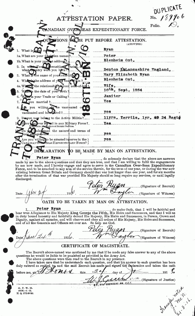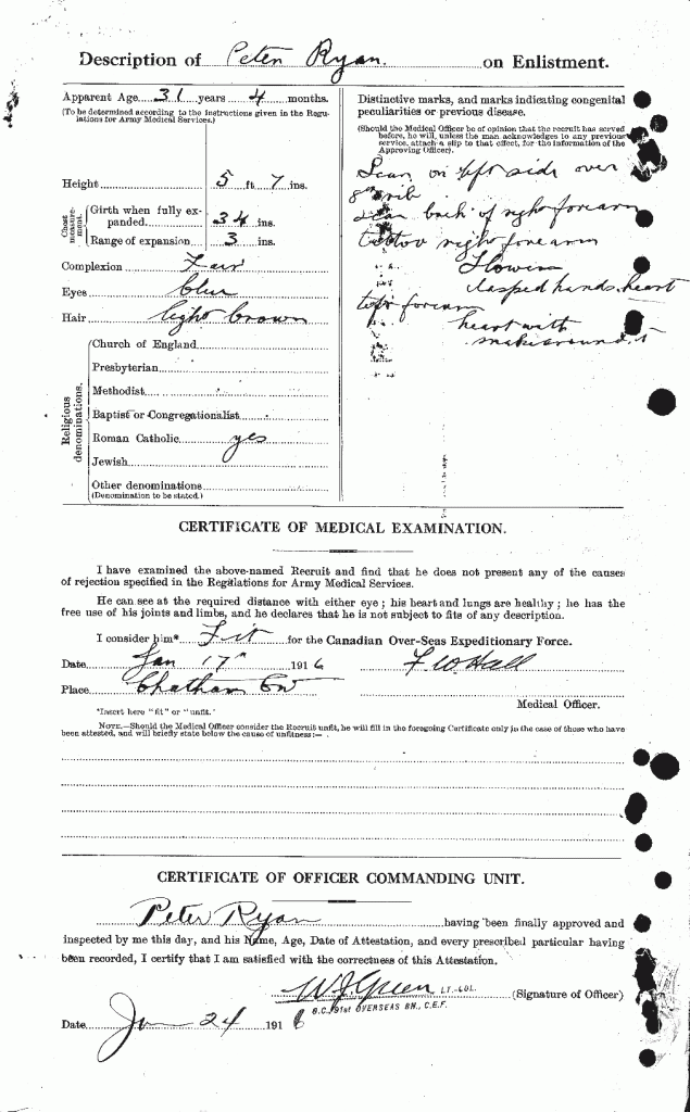 Enlisted with the 91st Battalion at St. Thomas, Ontario on 24 January 1916. He was married to Mary Elizabeth Ryan resident at Blenheim, Ontario. He was a janitor and stood 5’7″ tall. He was of the Roman Catholic faith and claimed prior military experience having indicated 11 years with the Territorials. He also had 1 year experience with the local Canadian Militia unit, the 24th Kents.