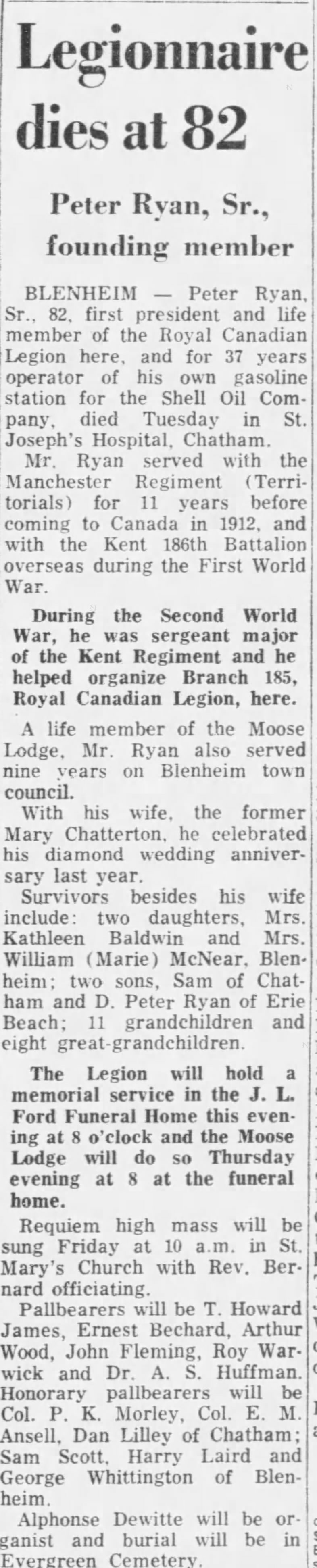 BLENHEIM — Peter Ryan, Sr., 82, first president and life member of the Royal Canadian Legion here, and for 37 years operator of his own gasoline station for the Shell Oil Company, died Tuesday in St. Joseph’s Hospital, Chatham.
