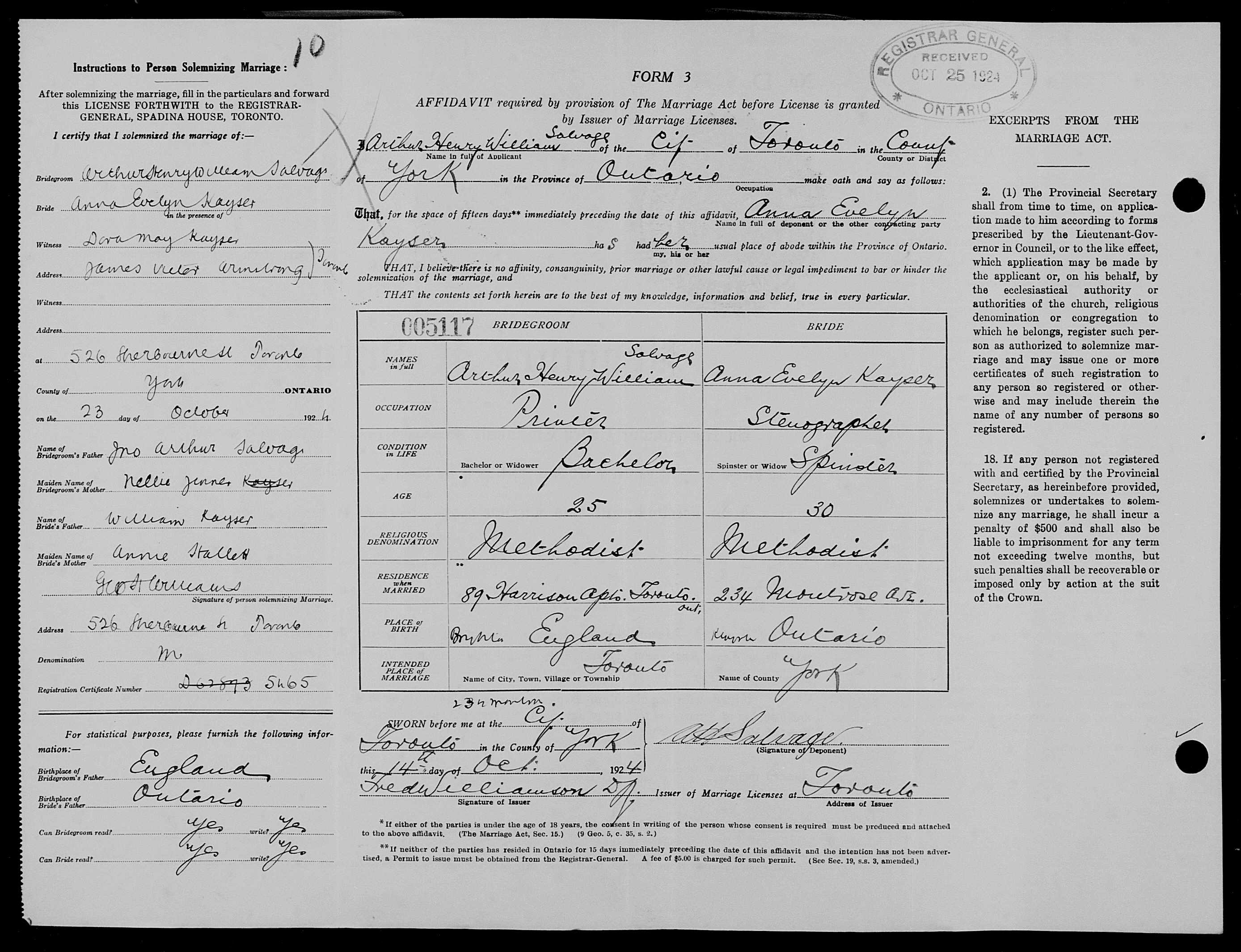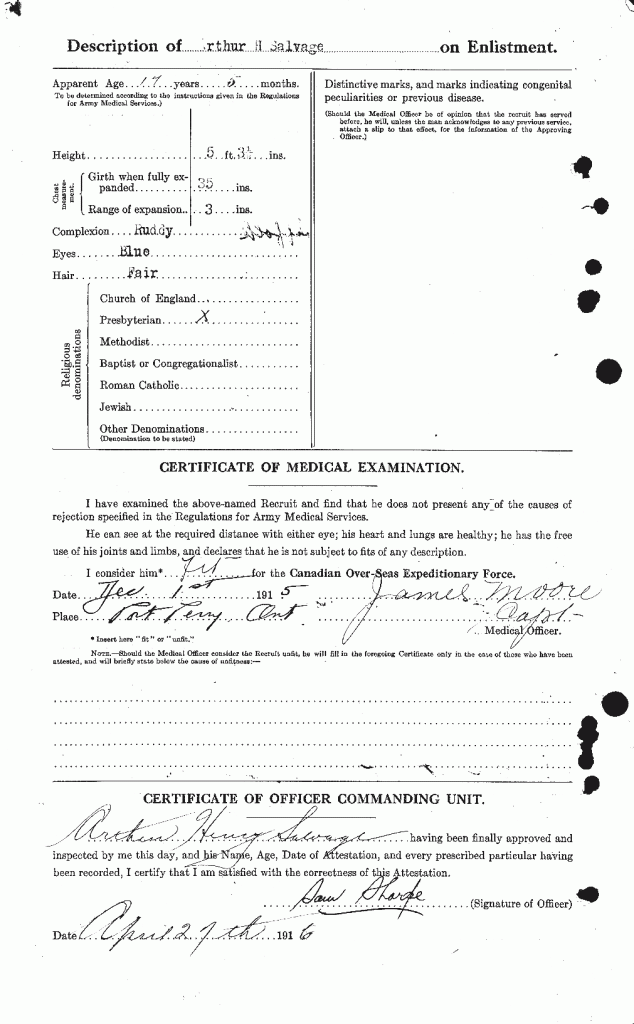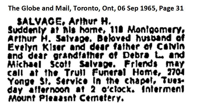 Family Search: Arthur William Henry Salvage was born on 3 June 1898, in Suffolk, England, United Kingdom as the son of Jno Arthur Salvage and Nellie Jenne. He had at least 1 son with Anna Evelyn Kayser. He lived in Port Perry, Ontario, Ontario, Canada in 1915. He registered for military service in 1915. In 1915, at the age of 17, his occupation is listed as farmer in Port Perry, Ontario, Ontario, Canada. He died on 5 September 1965, in Toronto, Ontario, Canada, at the age of 67, and was buried in Mount Pleasant Cemetery, Toronto, Ontario, Canada.