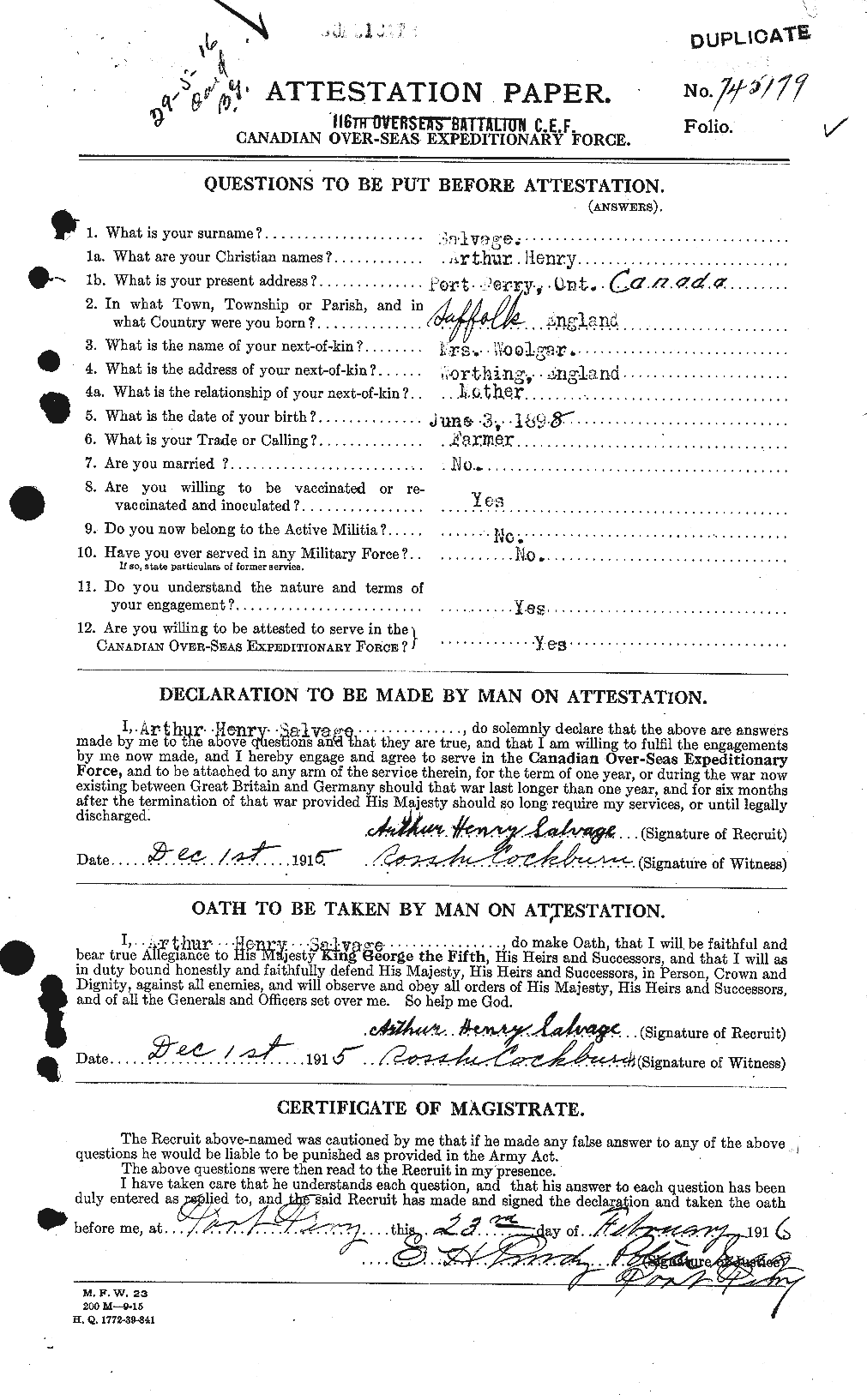 | Enlistment place | Port Perry |