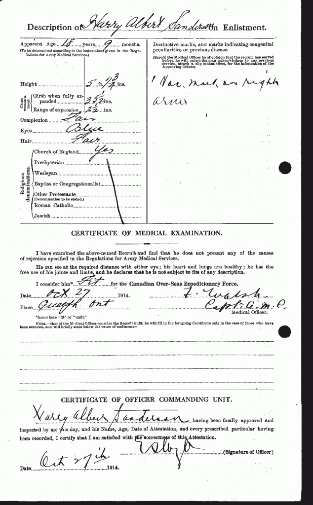 Family Search: When Harry Albert Sanderson was born on 12 January 1896, in Guelph, Wellington, Ontario, Canada, his father, James Albert Sanderson, was 25 and his mother, Isabella Black, was 29. He married Camilla Janet Badeau on 30 September 1919, in Guelph, Wellington, Ontario, Canada. He registered for military service in 1914. In 1914, at the age of 18, his occupation is listed as weaver. He died on 19 November 1962, at the age of 66, and was buried in Woodlawn Memorial Park, Guelph, Wellington, Ontario, Canada.