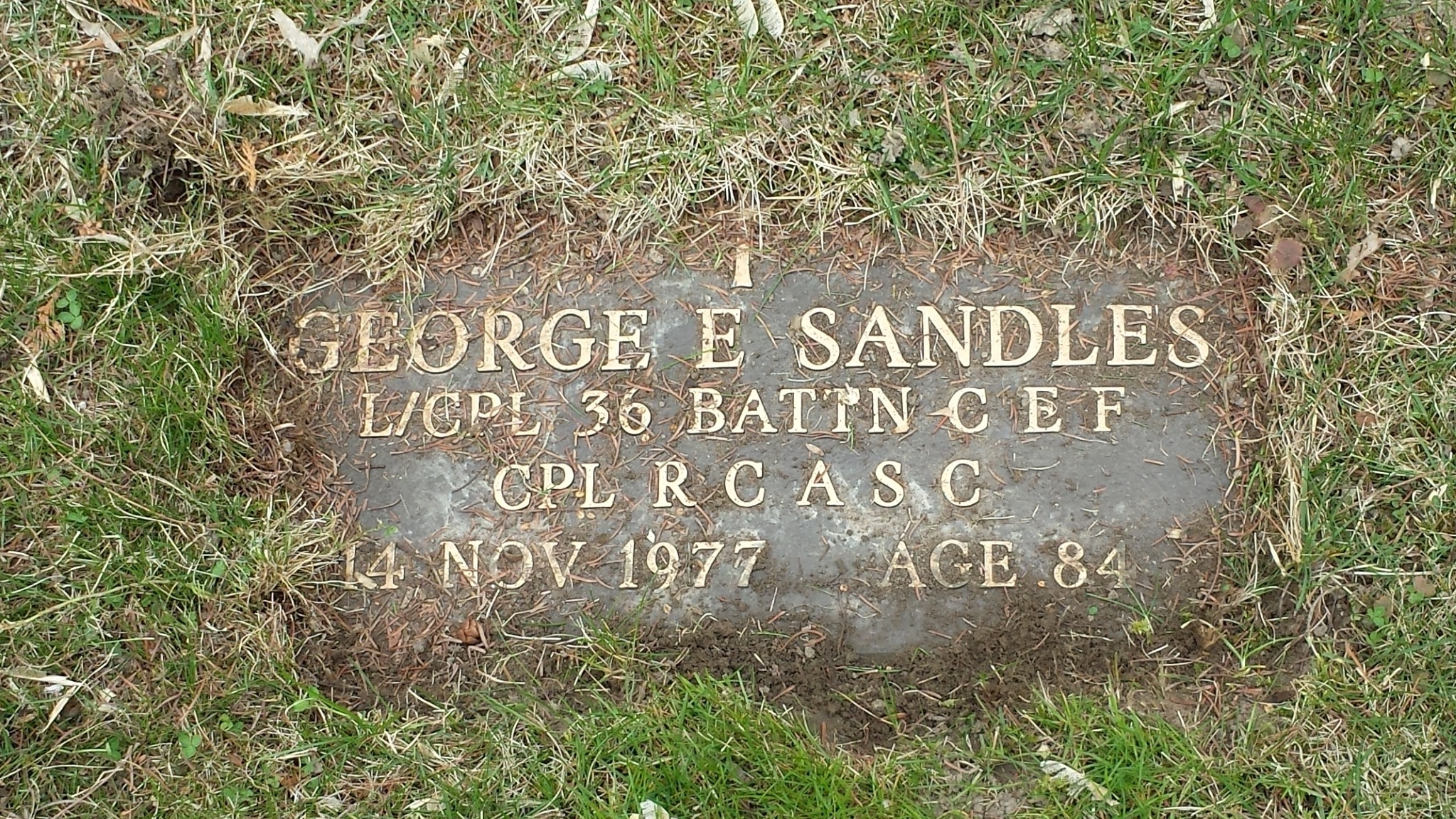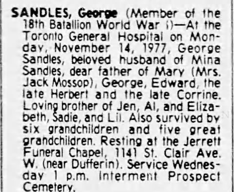 Family Search: When Private George E. Sandles was born on 8 June 1895, in Tipperary, County Tipperary, Ireland, his father, Thomas Dennis Sandles, was 38 and his mother, Ellen Blackwell, was 31. He married Jemina Strain Pollock on 10 October 1919, in Toronto, Ontario, Canada. They were the parents of at least 3 sons and 2 daughters. He immigrated to Canada in 1913 and lived in Cloughjordan, County Tipperary, Ireland in 1901. He died on 14 November 1977, in Toronto, Ontario, Canada, at the age of 82, and was buried in Toronto, Ontario, Canada.