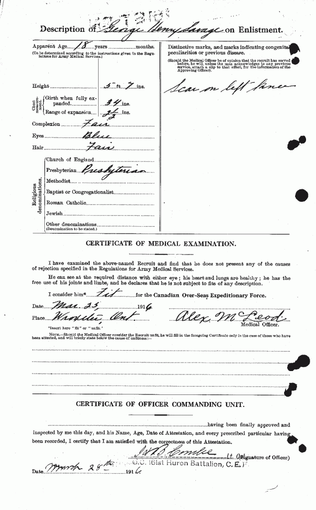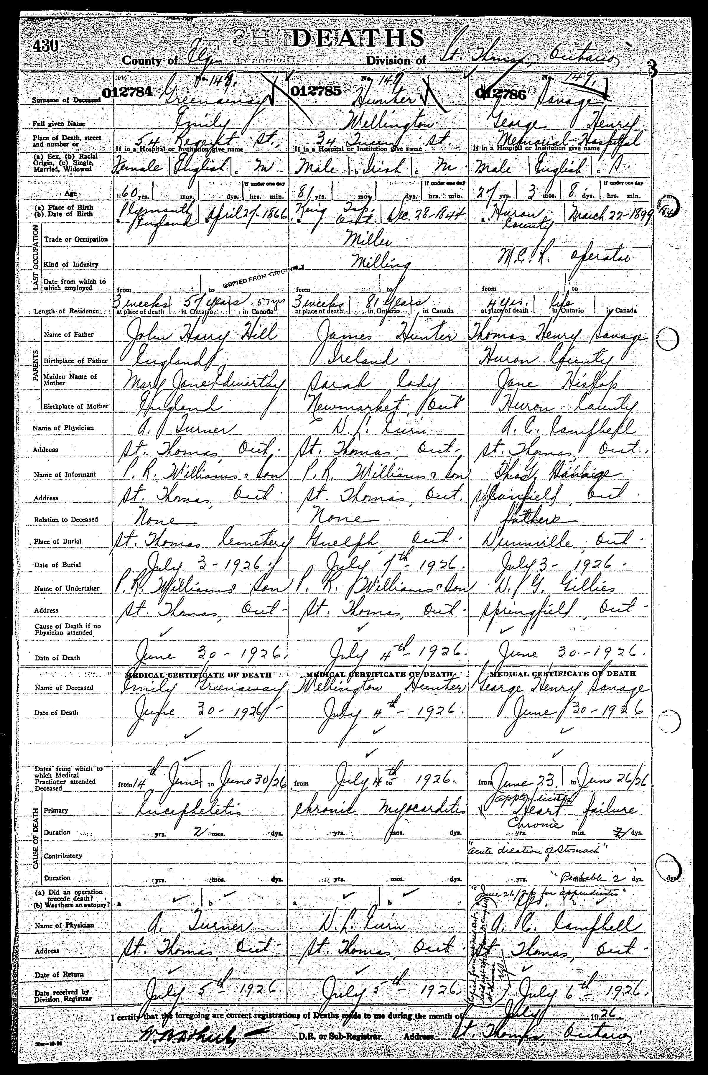 The St. Thomas Daily Times-Journal had the followng, dated from Springfield, July 3rd, which refers to a former resident: “Never since the death of Dr. George Thompson, has a more sudden and terrible shock came to the people of the village, than when it became known that George Savage, familiarly known to all his friends as “Joe”, had passed away at the Memorial Hospital, St. Thomas, on Wednesday afternoon. Mr Savage was operated upon last Saturday afternoon, for appendicitis, and his condition was considered satisfactory, so the news of his death cast a gloom over the whole community. Mr. Savage was born near Wroxeter, and received his early education there. He went overseas in 1914 with the Huron County Battalion No, 161, and when it broken up, he joined the 18th Battalion, in France. Mr. C. Clark of Aylmer, was his platoon sergeant at the time his brother, Thomas, was killed by the explosion of a shell. He came to Springfield four years ago, as an operator on the M. C. R. During those years, he had made a host of friends and was the idol of the little ones, who were always sure of a ride in “Joe’s” car. For two years, he had made his home with Rev. H. and Mrs. Wood, and by his acts of thoughtfulness and many little acts of Kindness, he endeared himself to the people. During the remainder of his residence here, he lived with Mrs. W.J.Lindsay and her brother, Alex Carrutheis, both of whom feel his loss very keenly. The remains were brought to Mrs. Lindsay’s home, on Wednesday night, and his parents came up from Canfield, where they now reside. He was a member of the I.O.O.F, and A.F. and A.M. and the O.E.S. Two weeks ago, he led the procession when the I.O.O.F. attended church. The funeral, which was held on Friday afternoon, was conducted by Revs, O. W. D. Cosens and H. Wood. The choir, with Mrs. J. Allison at the piano, furnished appropriate music, and Mrs. G. Grant sang “Will there be any Stars in my Crown.” The beautiful service of the Masonic Order was exemplified by W.M.George Grant and his staff. The floral offerings were beautiful. The pallbearers were; M.M.Black, M.McClintosh, R.B.McKenny, K.L.Moore, J.F.Harris and S.H.Simpson. The floral bearers were; G.A.Love, S.Willis, W.Cathers, L.O.Purdy, M.Moore, G.Craik, S.Walker and M.Charlton. A number of war veterns were present. Besides his parents, he is survived by his brother, Robert, of Buffalo, and also two sisters, Mrs. G. Bird, of Buffalo, and Miss Zelma, at home. After the conclusion of the service, the remains, accompanied by the parents, pallbearers and several friends, proceeded to the parental home, at Canfield, where a service was held at his home thence to Riverside cemetery, Dunnville. A number of carloads went down for the service. Following lines were composed by a friend who was overseas with him and who was recently ill in a London hospital;