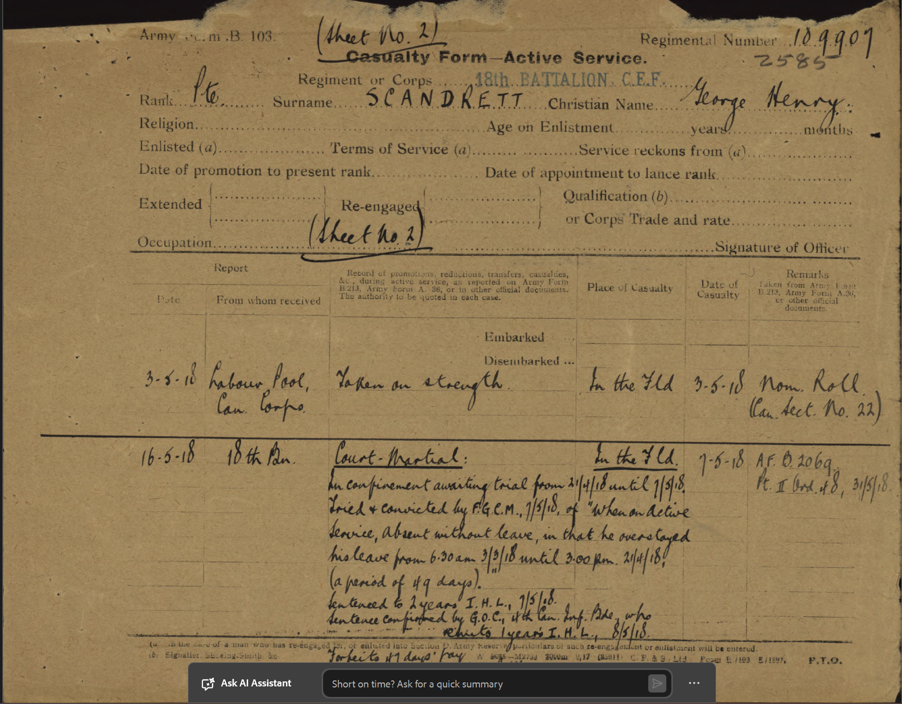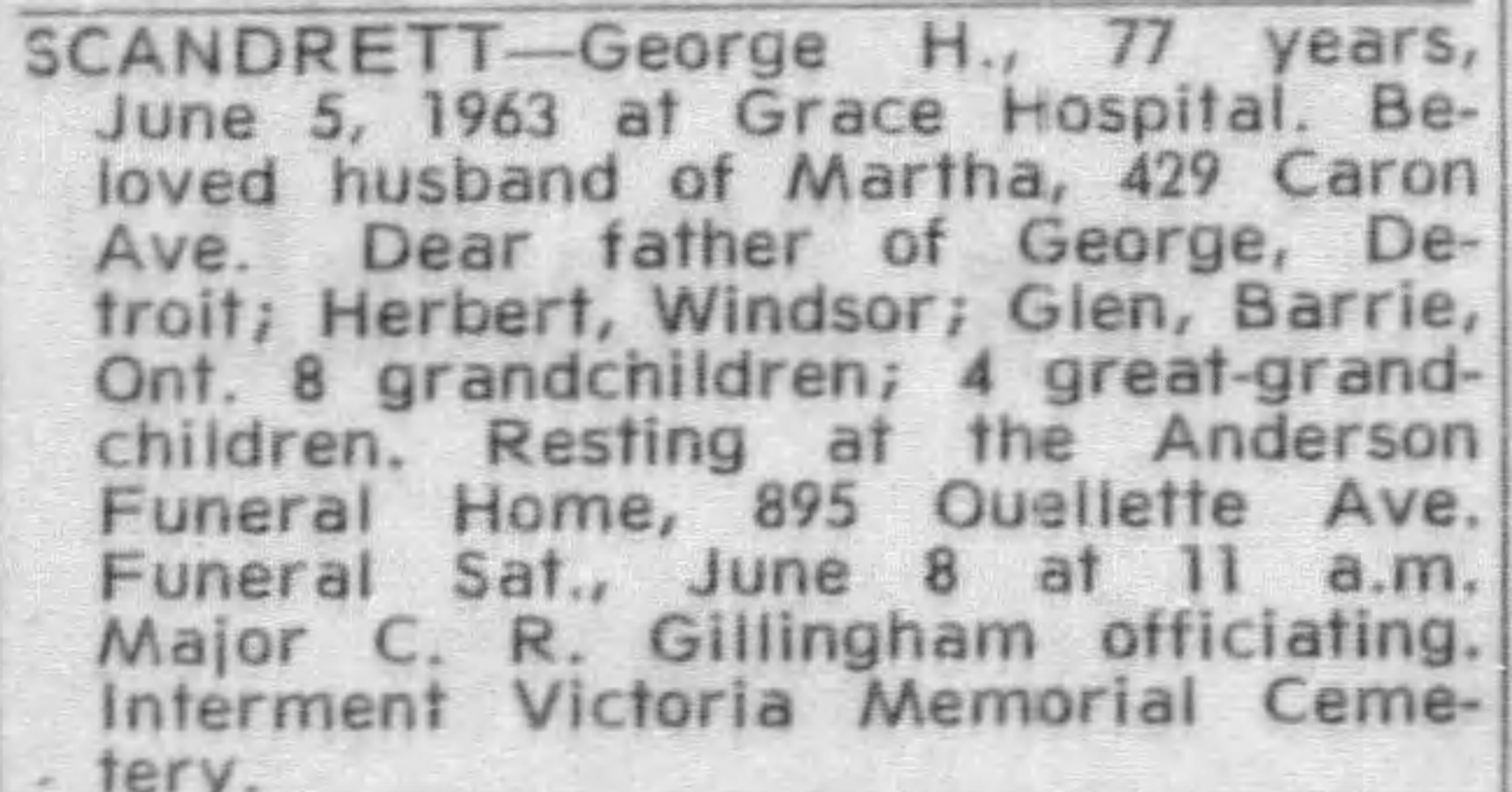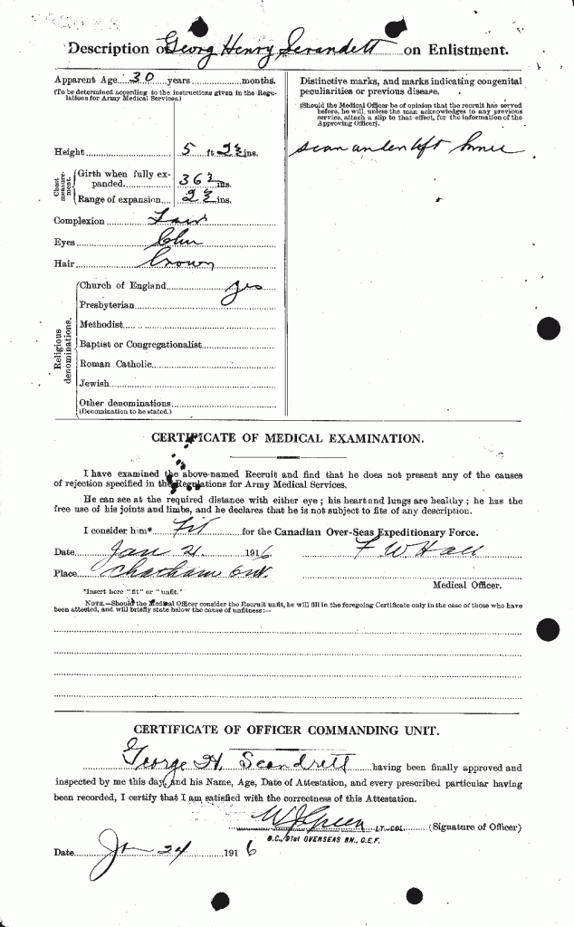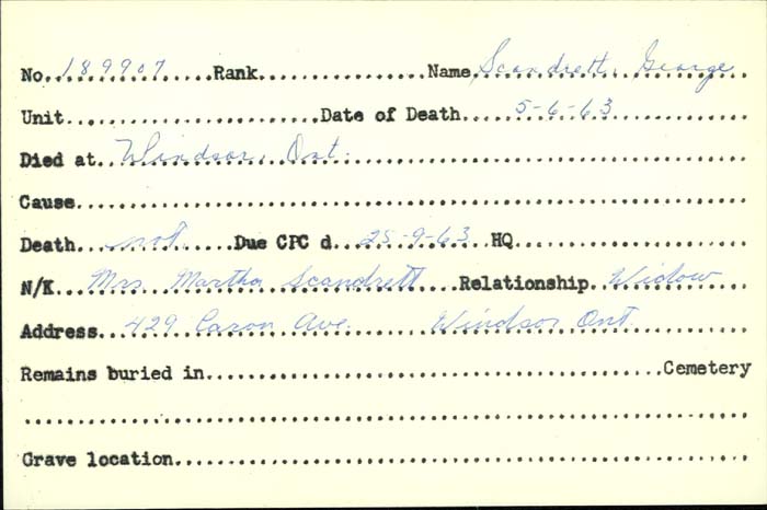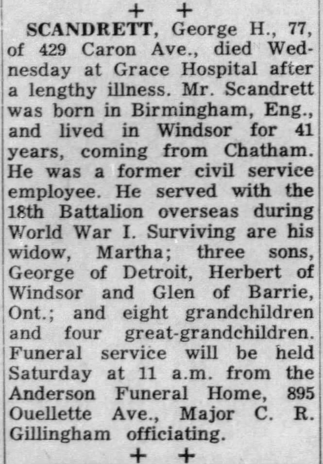 Family Search: Private George Henry Scandrett was born on 20 December 1886, in Vauxhall, London, England, United Kingdom. He married Martha Agnes Hewitt on 23 March 1908, in Birmingham, Warwickshire, England, United Kingdom. They were the parents of at least 3 sons. He immigrated to Quebec City, Quebec, Canada in 1911 and lived in Chatham, Kent, Ontario, Canada for about 5 years. He registered for military service in 1916. In 1916, at the age of 30, his occupation is listed as labourer in Chatham, Kent, Ontario, Canada. He died on 5 June 1963, in Windsor, Essex, Ontario, Canada, at the age of 76, and was buried in Victoria Memorial Gardens, Oldcastle, Essex, Ontario, Canada.